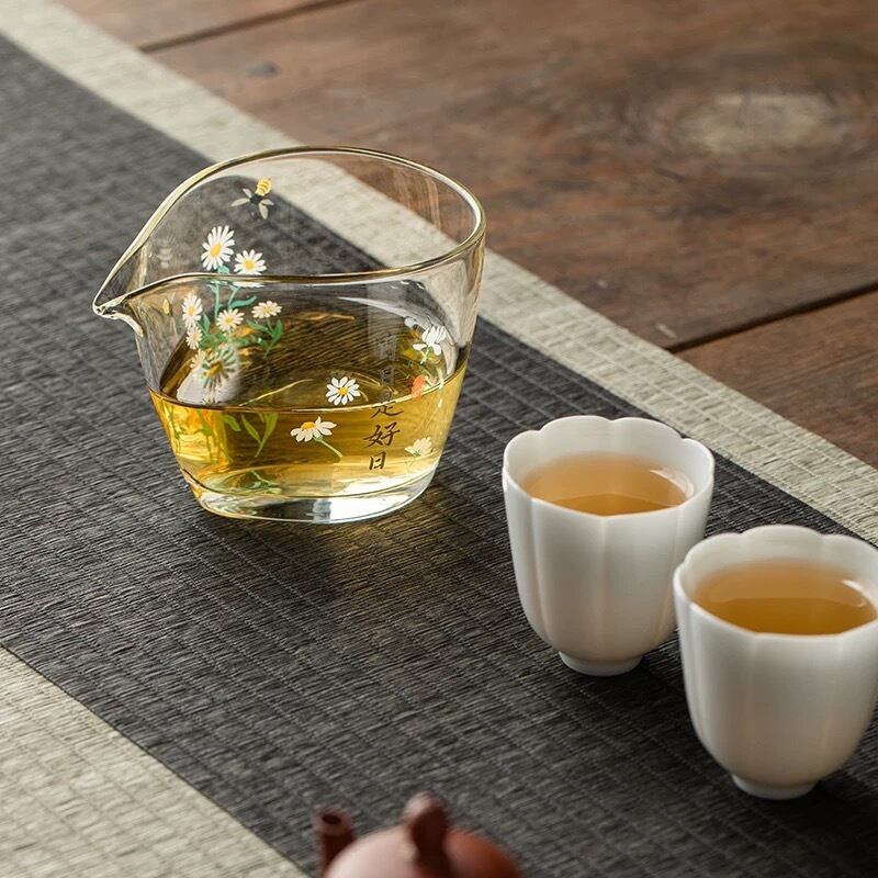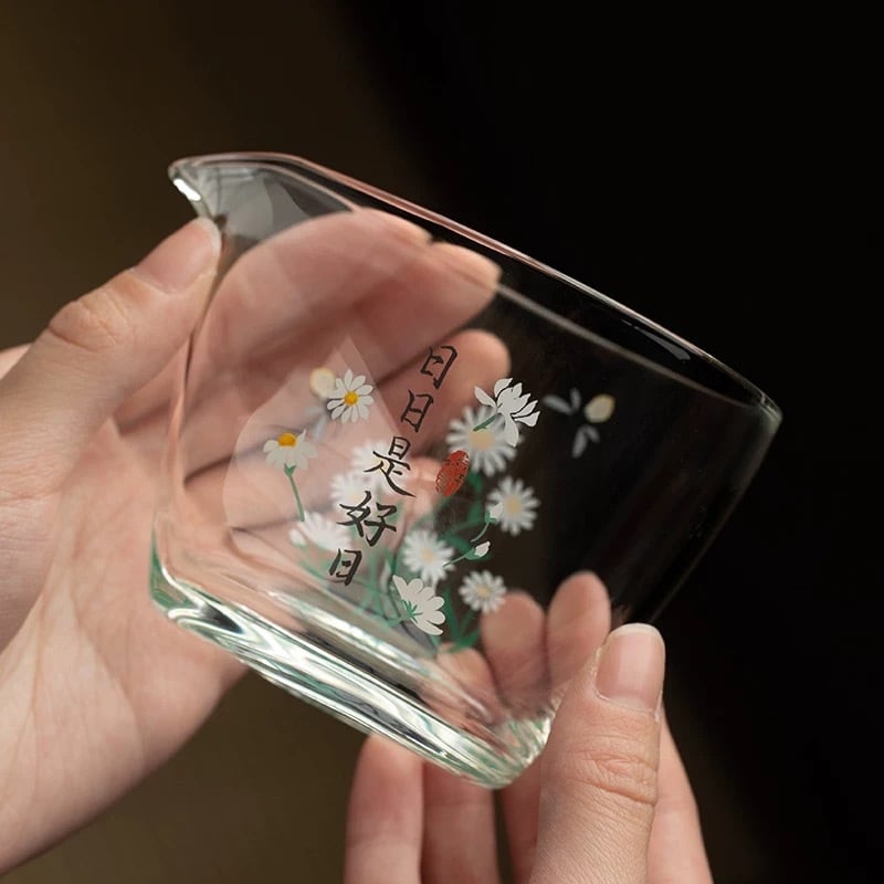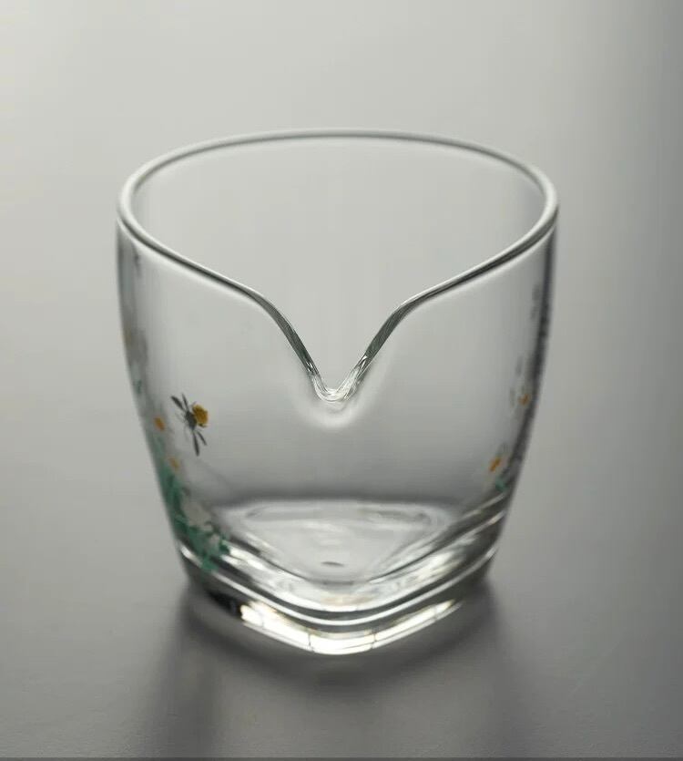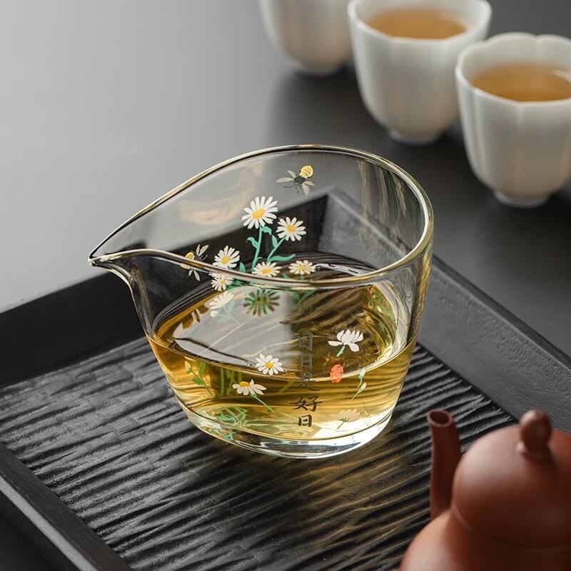 手作り手描き耐熱ガラス茶海、菊花とハチさんが春を思わせる涼しげなデザインの一品♪
