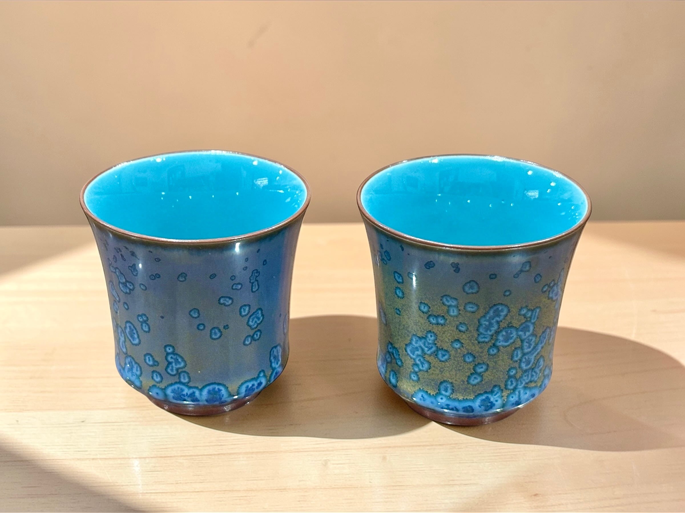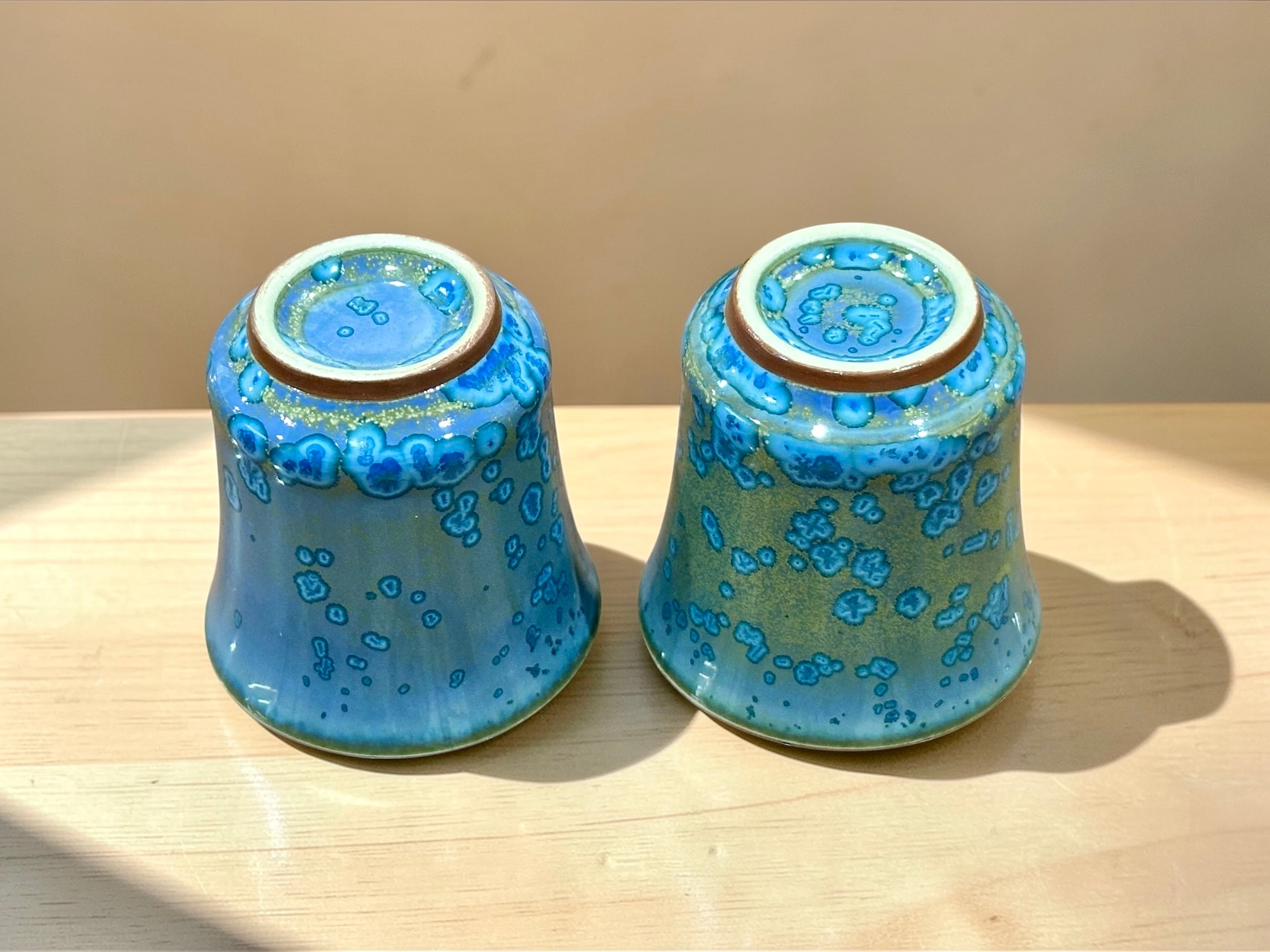 茶杯から手作りされ、釉薬をたっぷり塗り高温(1300度)で3日間絶え間なく焼き上げることで釉薬の自然なグラデーションと流動感が生まれます。