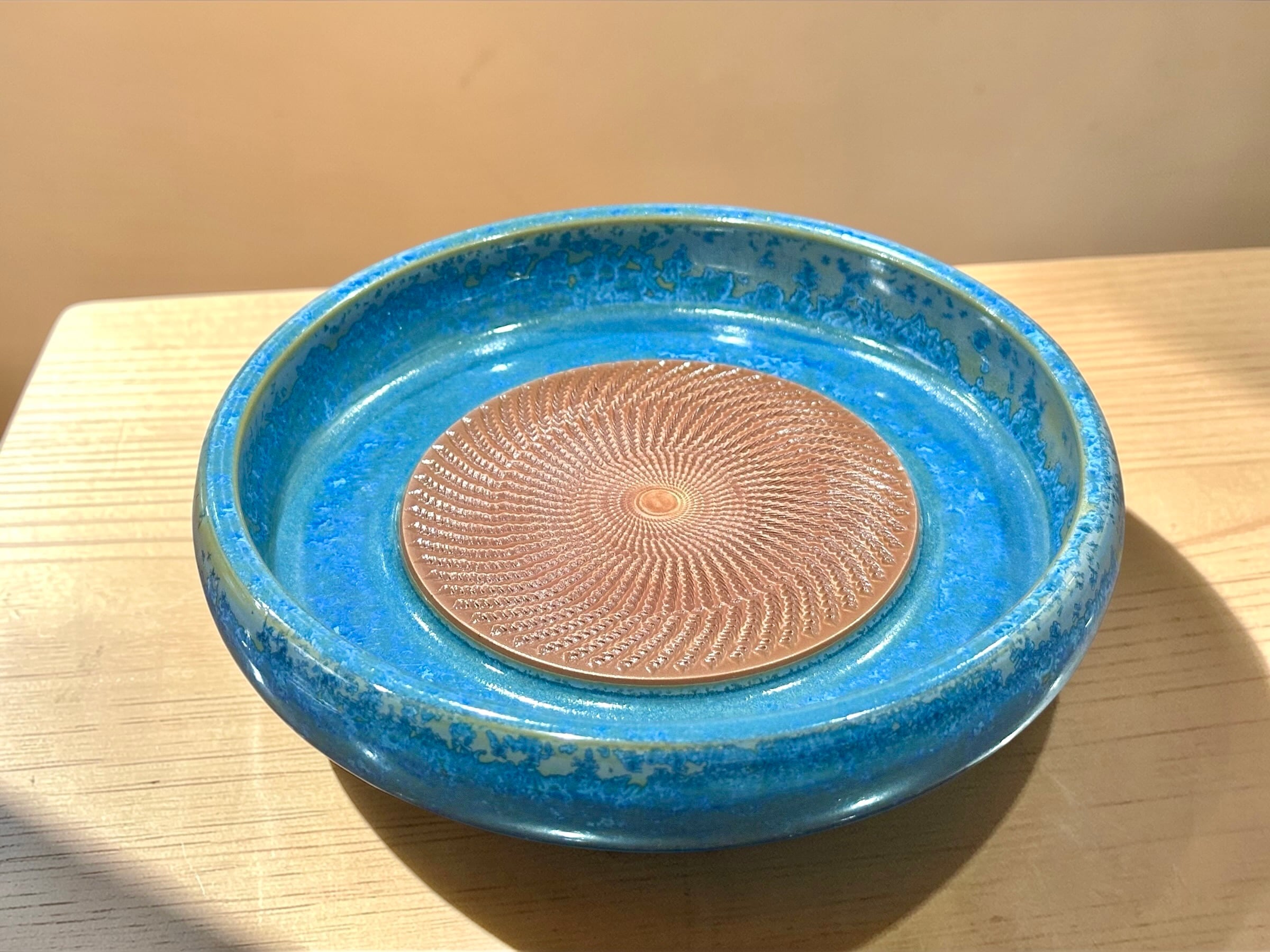 深海のようなブルーとゴールドの釉薬の結晶が美しいグラデーションを生み出しております。