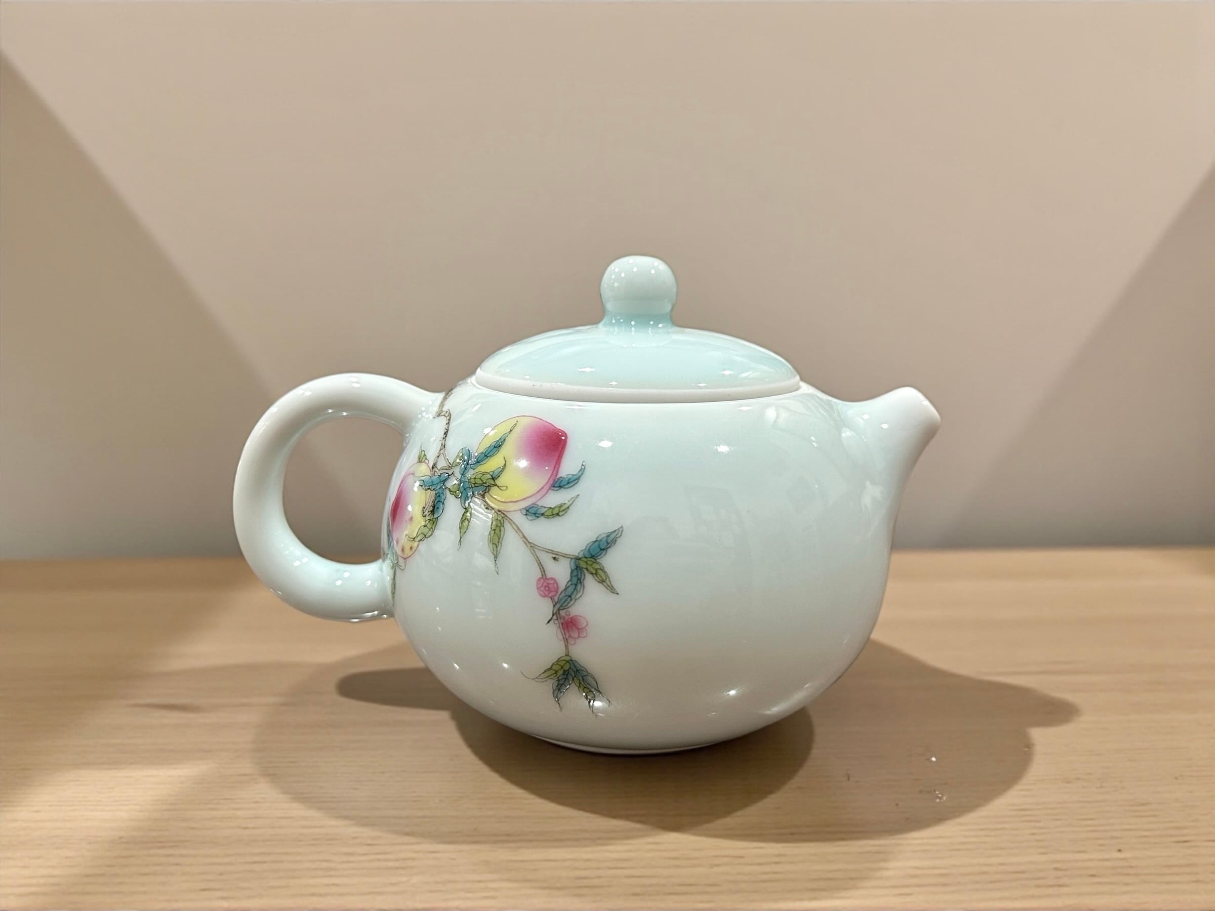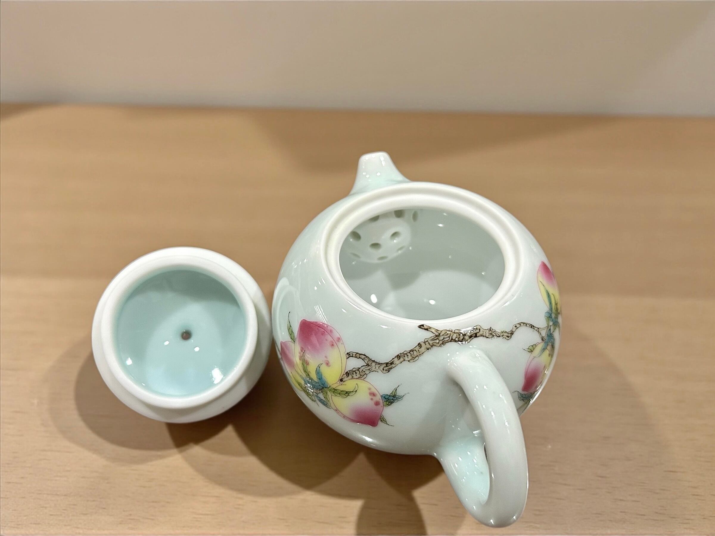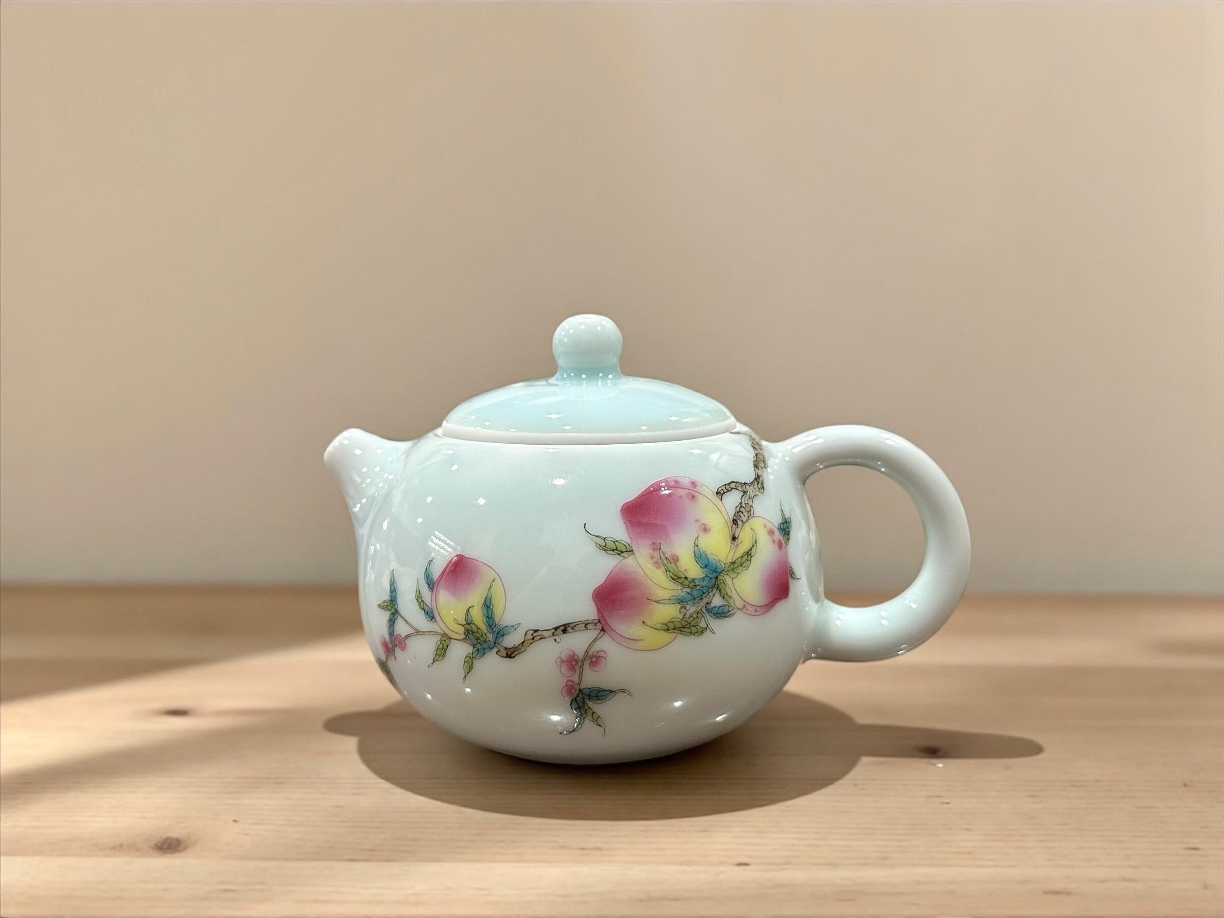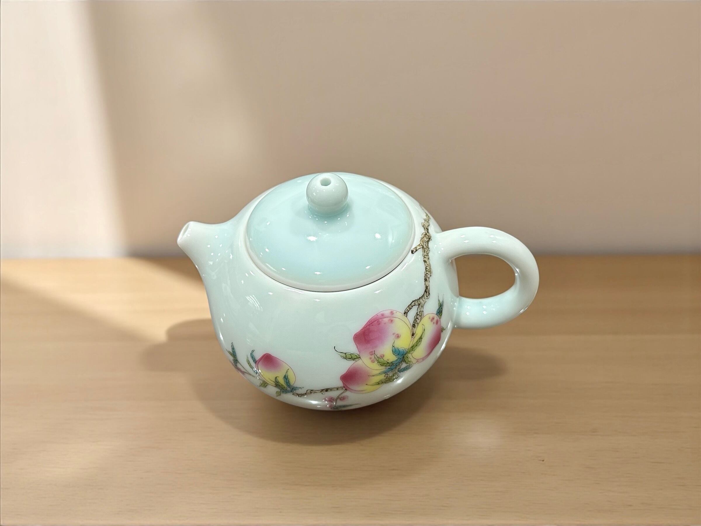 優しいブルーの青磁をベースに色鮮やかな桃の絵が映えます。
