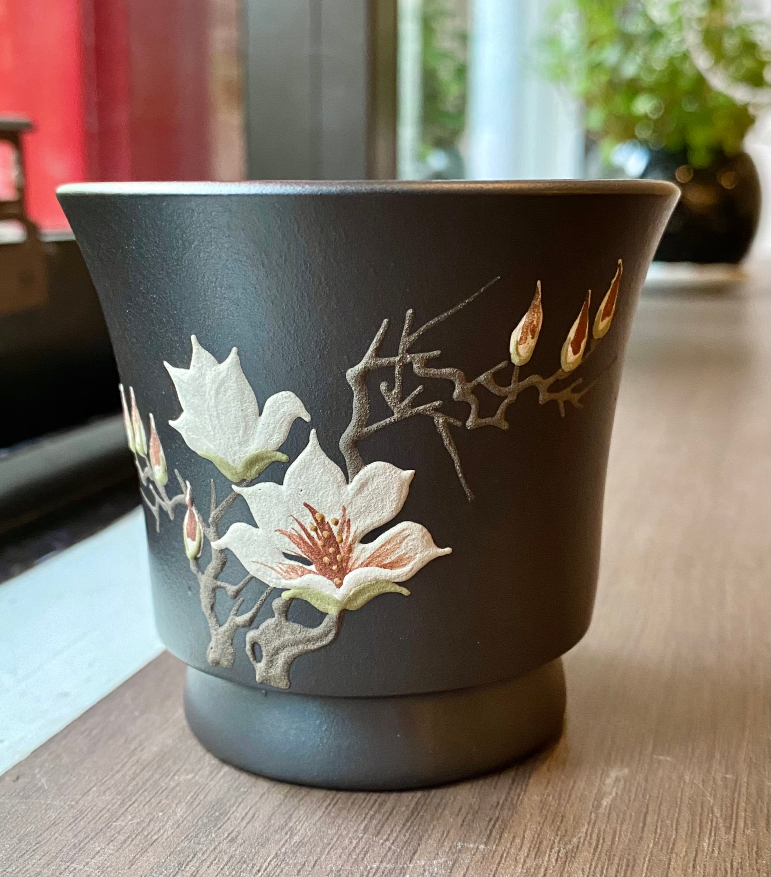 表面には立体的な木蓮が一つ一つ手描きでデザインされております。