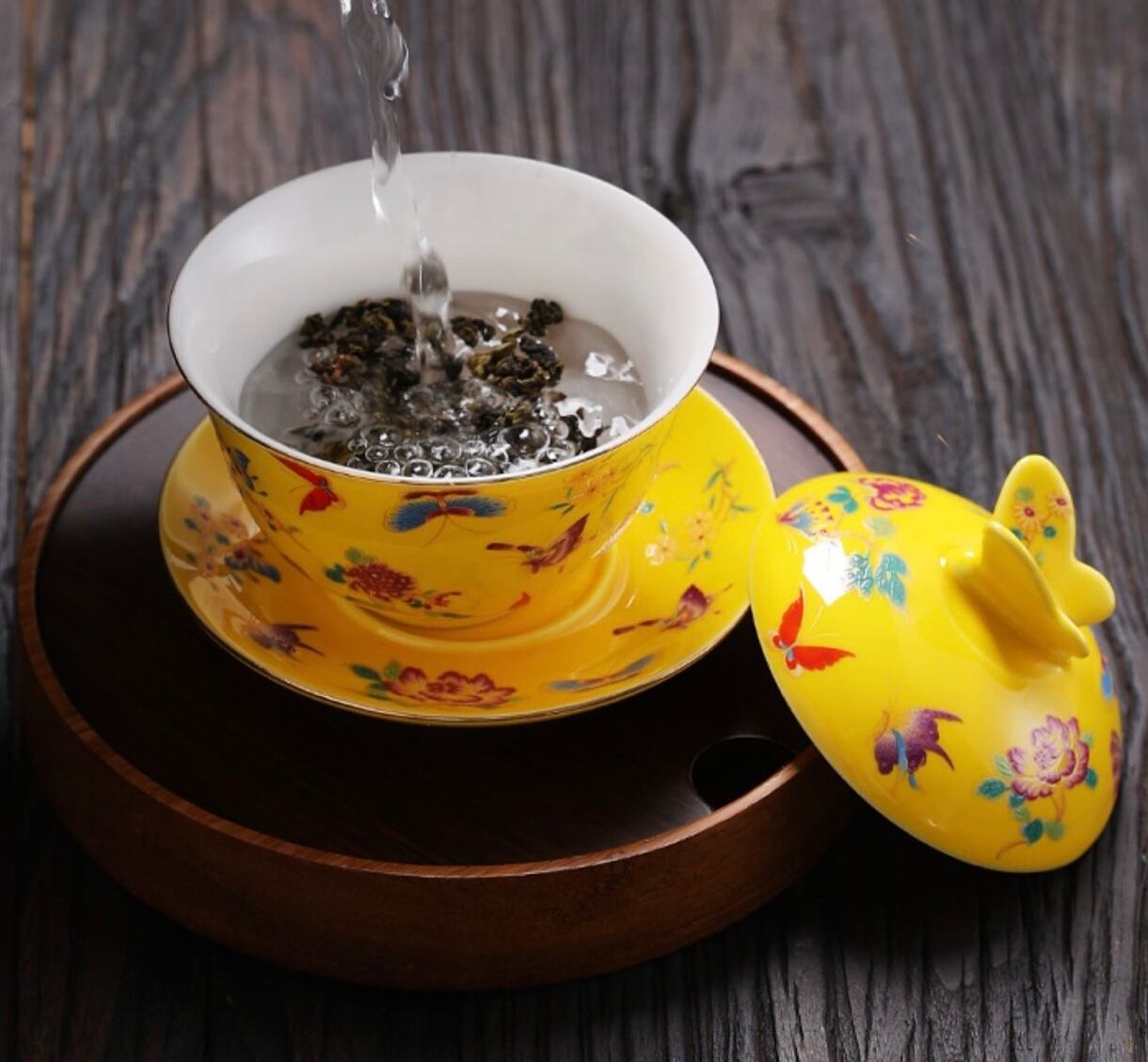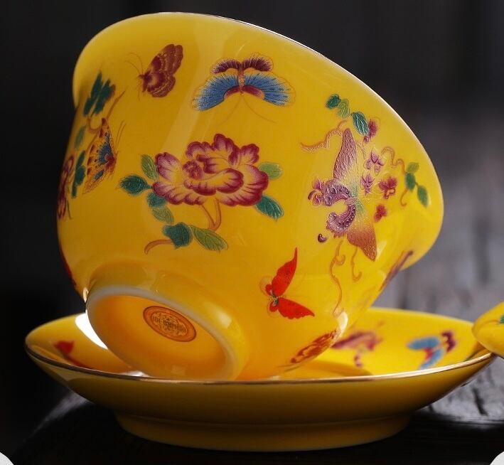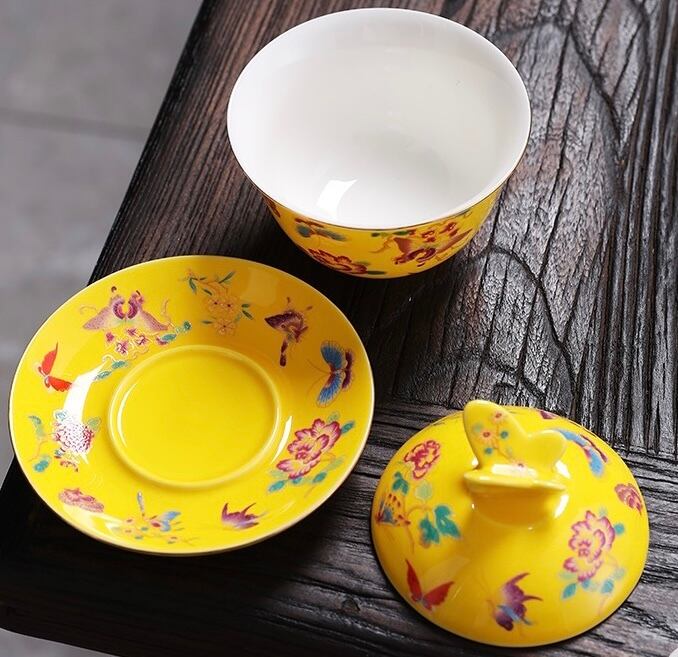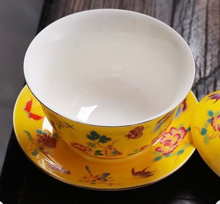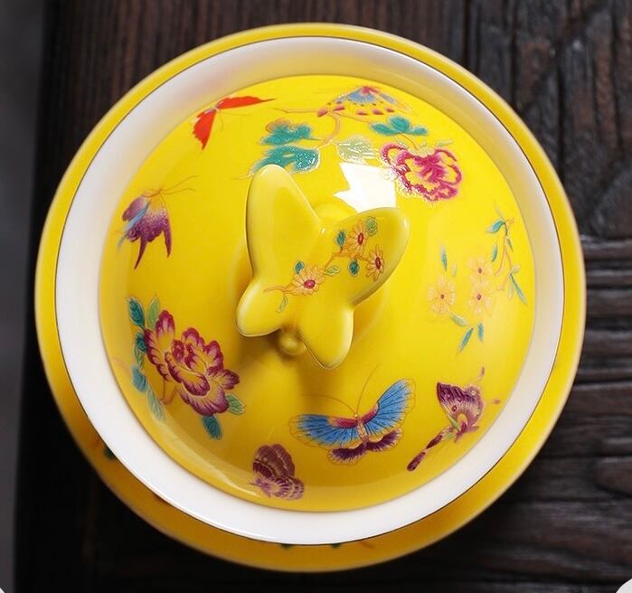 鮮やかな黄色が美しい磁器製。360度異なる花や蝶々が細かく描かれているため、どの角度から見ても飽きがこない新鮮さを感じられます。