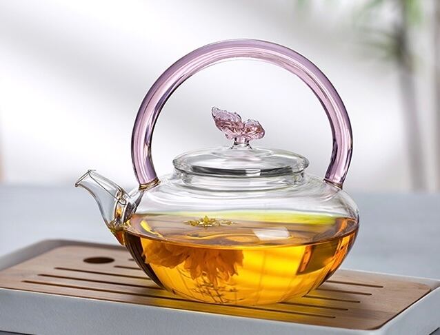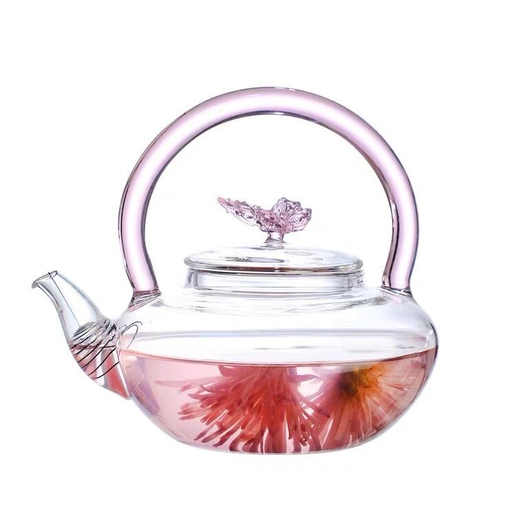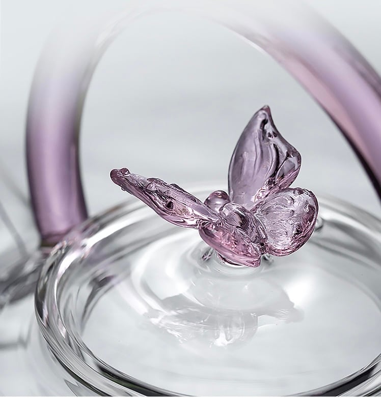 手作り耐熱ガラス製、淡いピンク色がポイントの蝶のデザインが美しい茶壷です。