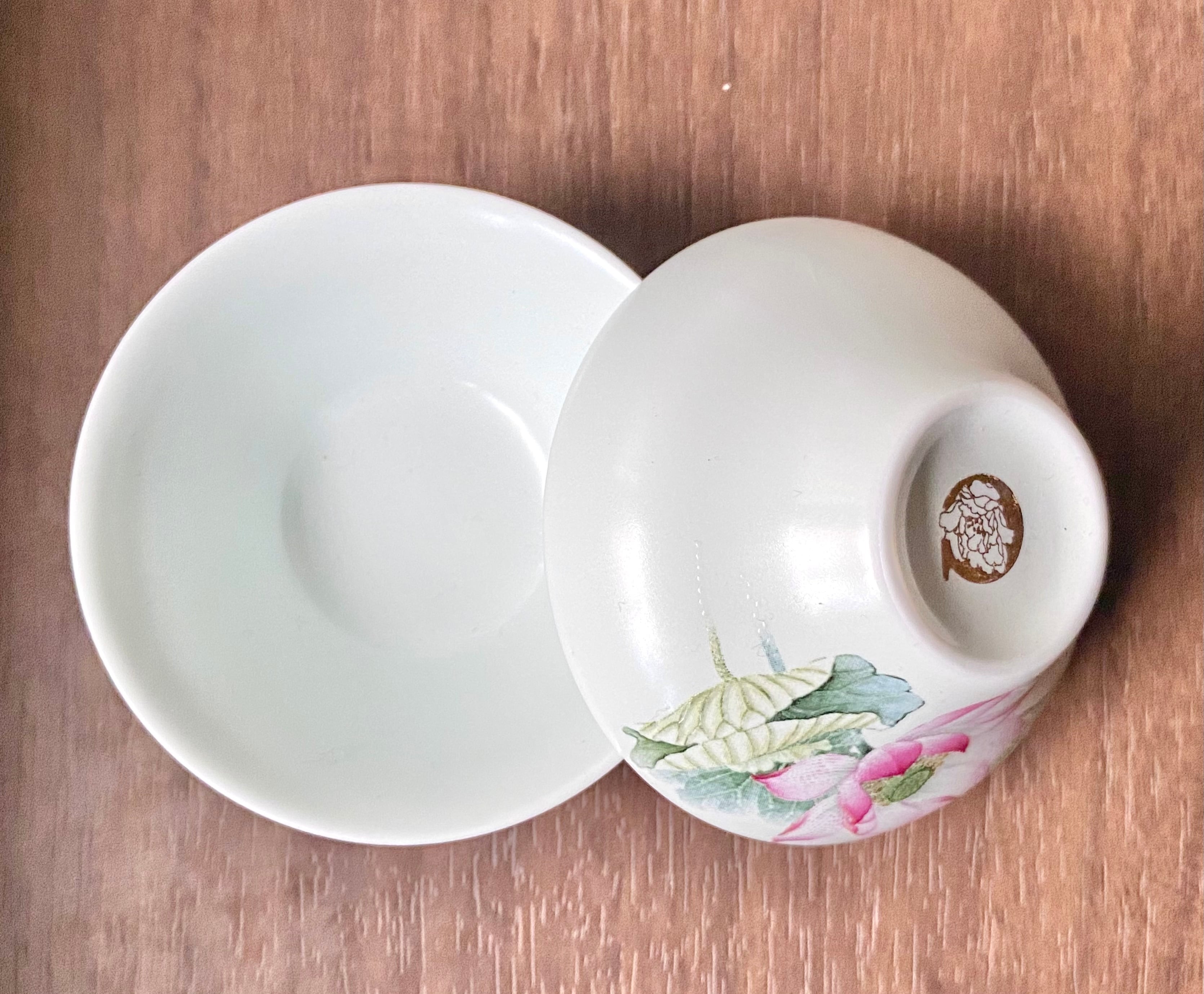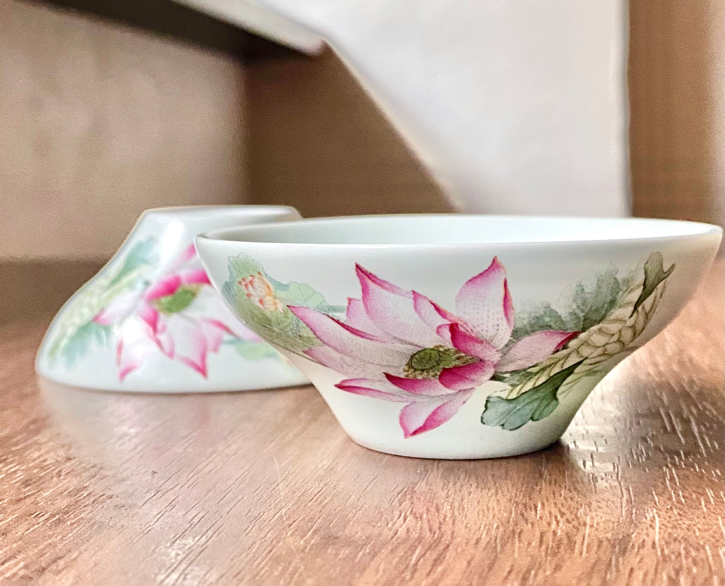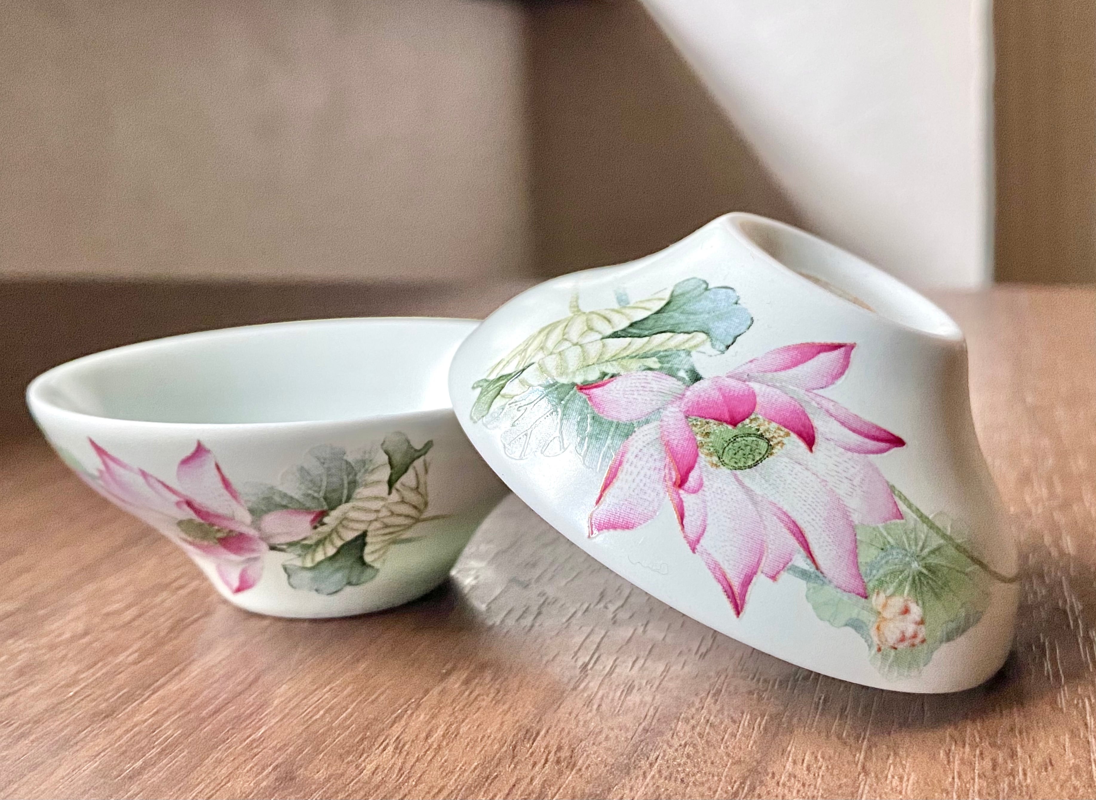 淡く優しい水色の青磁ベースに、鮮やかな蓮花がデザインされた贅沢な茶杯です。
