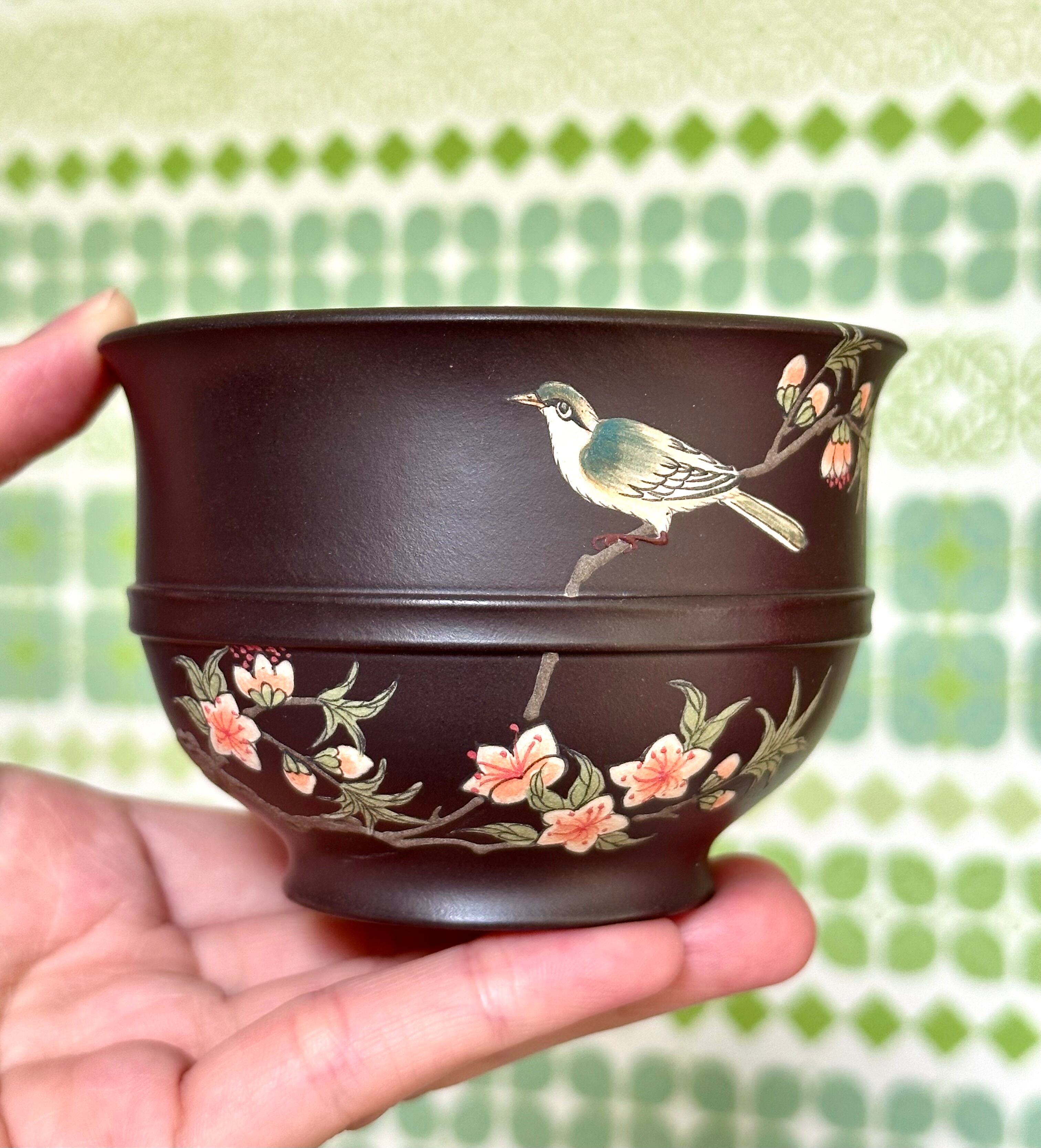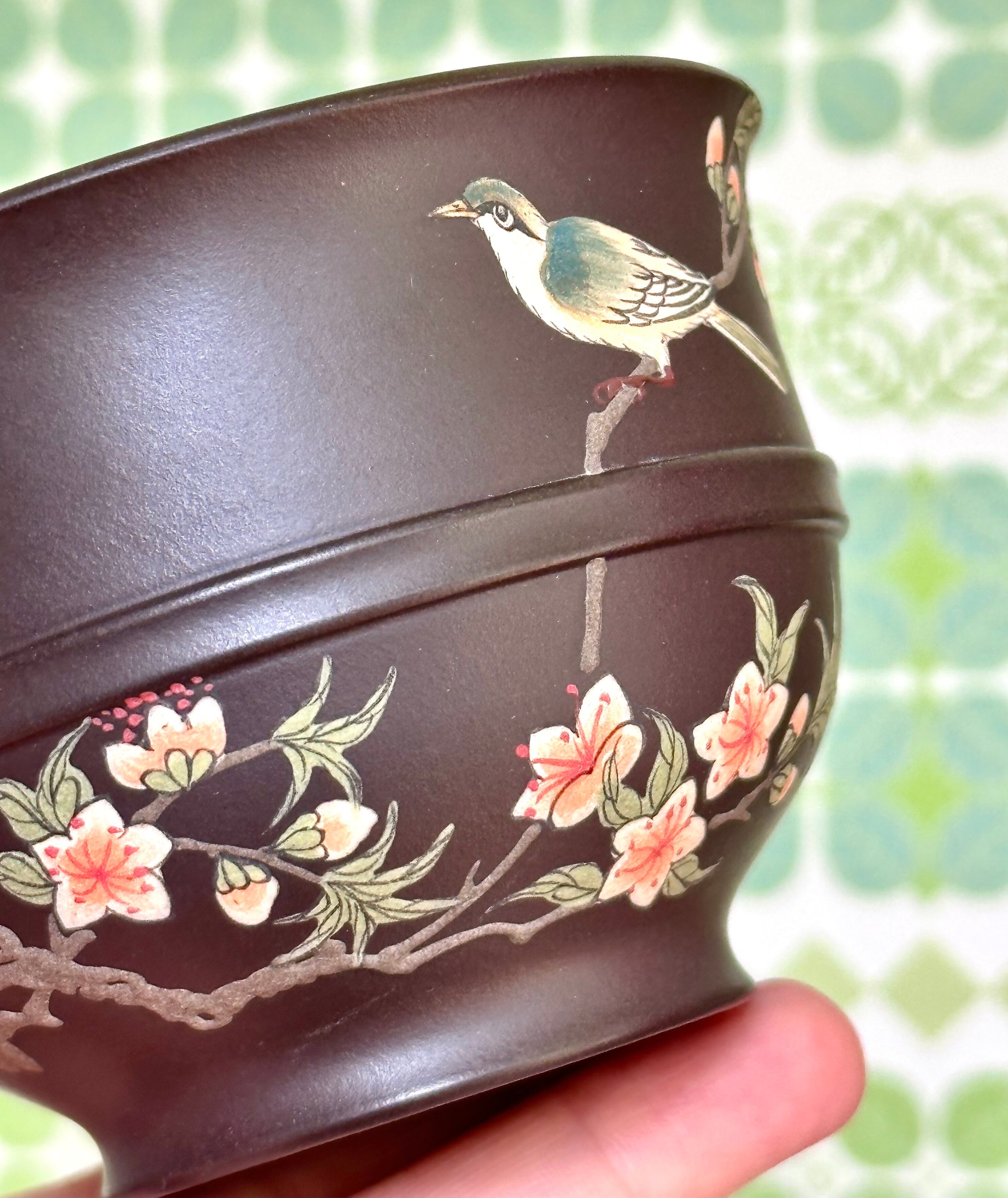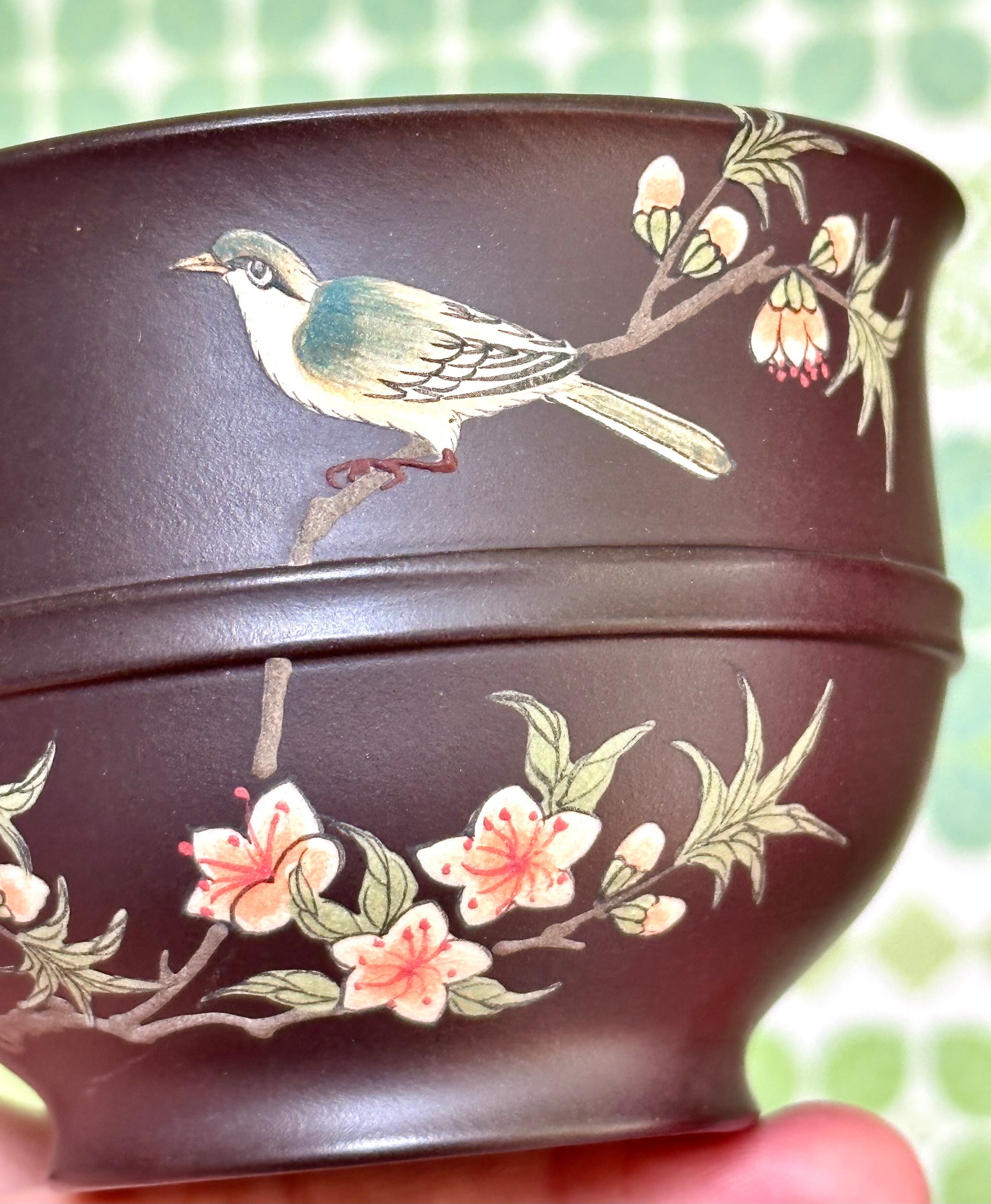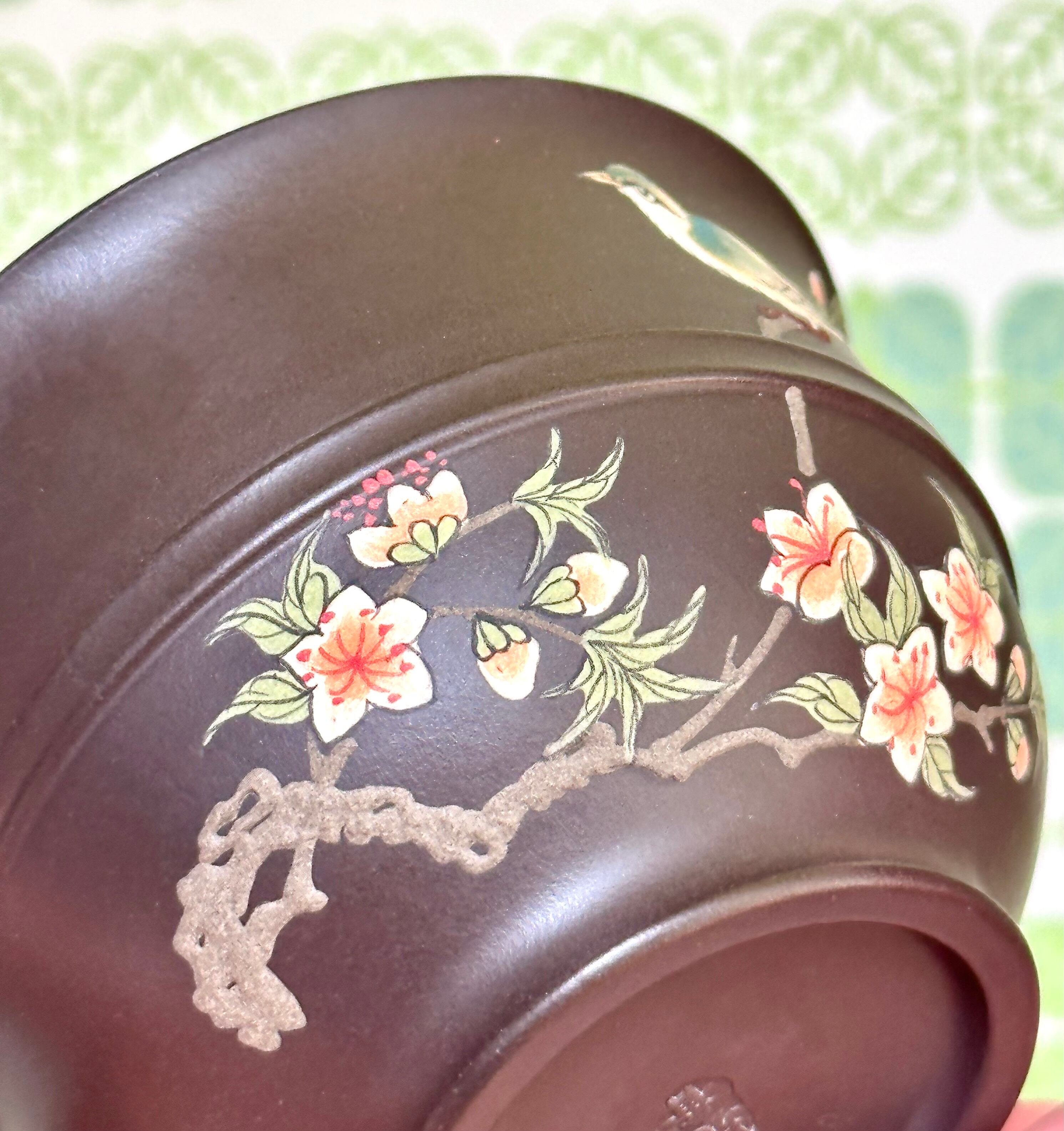 茶壷の表面には立体的な桃花と小鳥が細部までこだわってデザインされております。