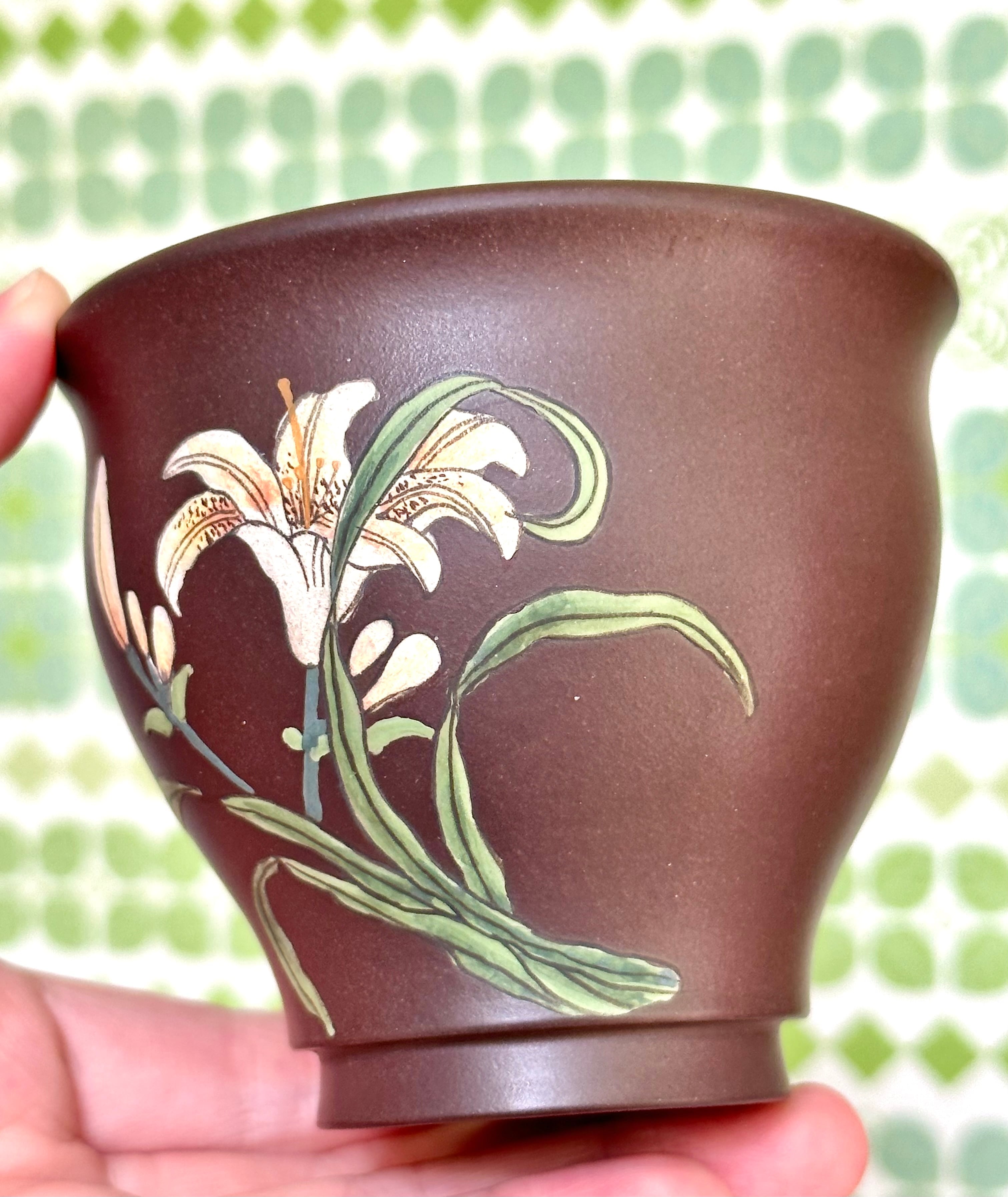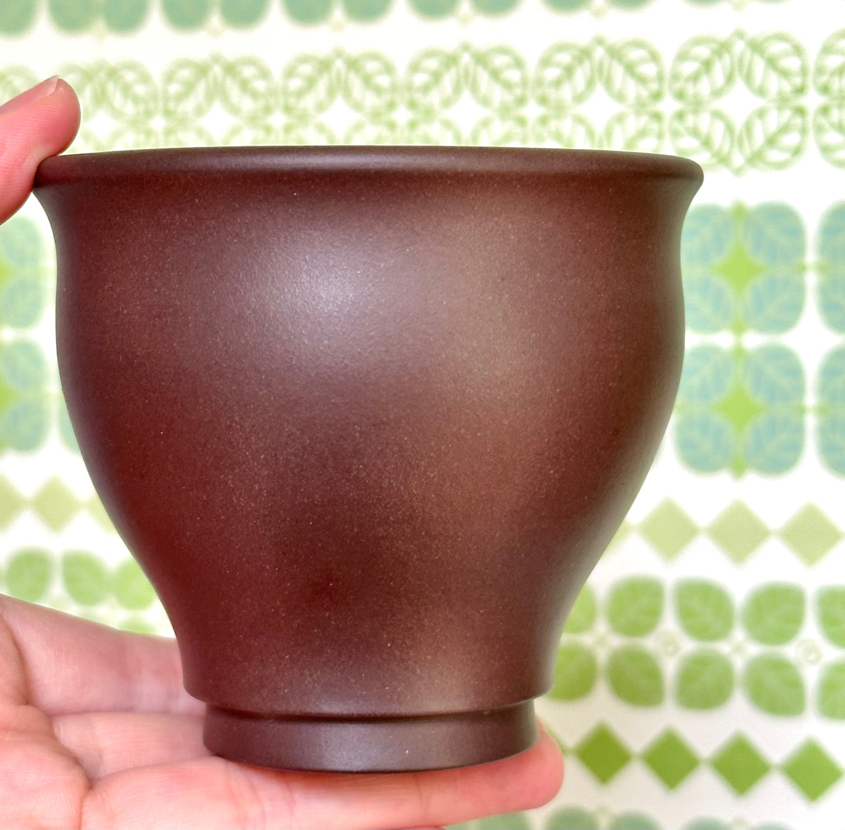 紫砂の中でも紫泥という赤紫色を帯びた茶色の土を用いて作られた全手工の茶杯です。