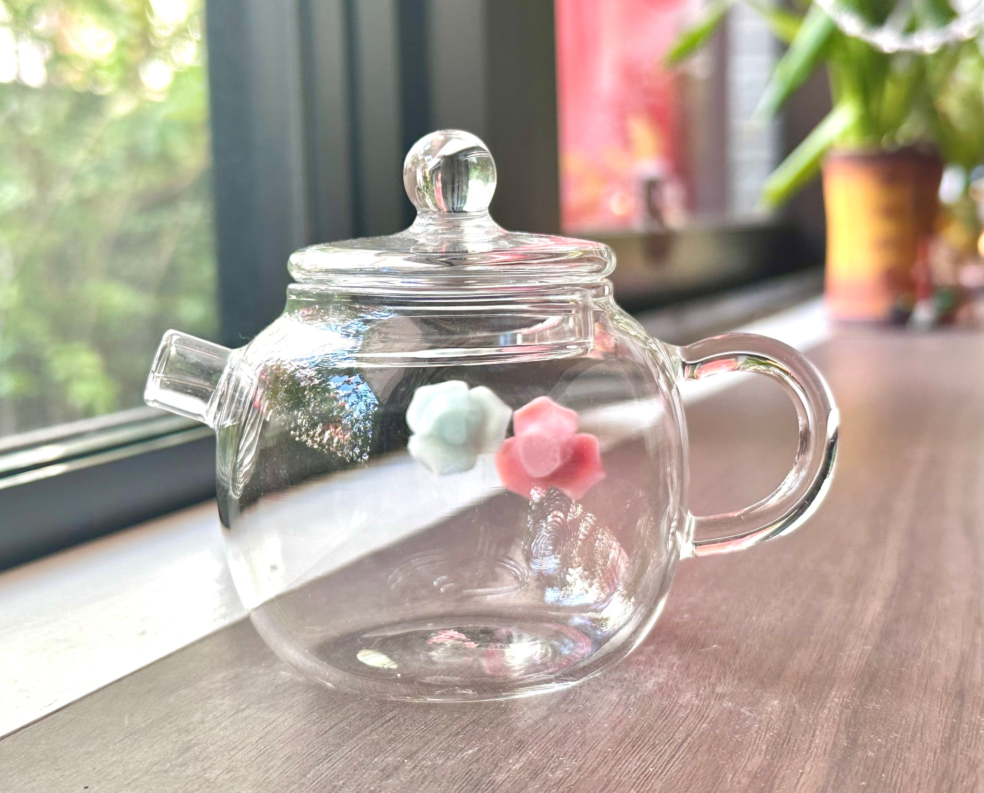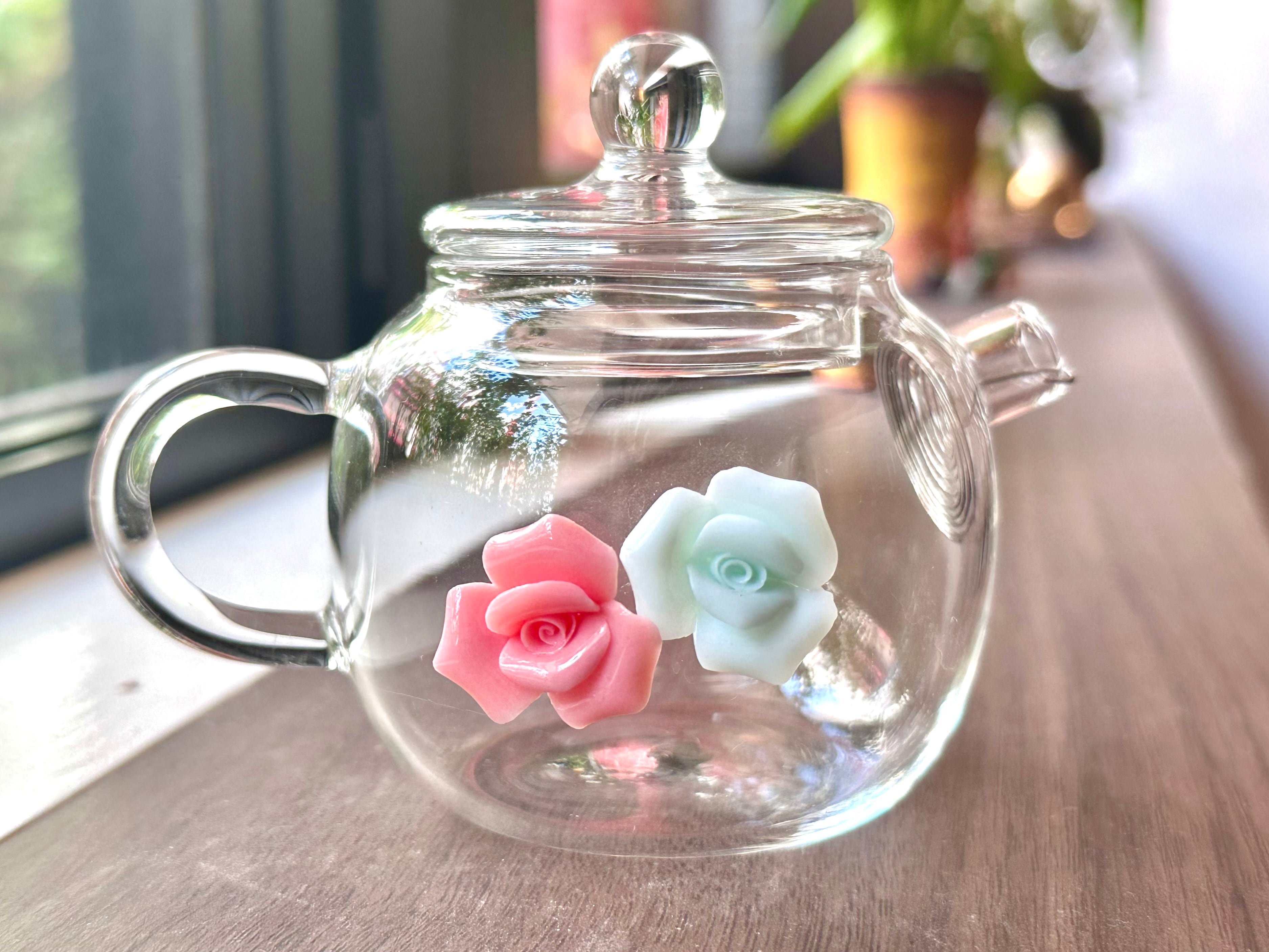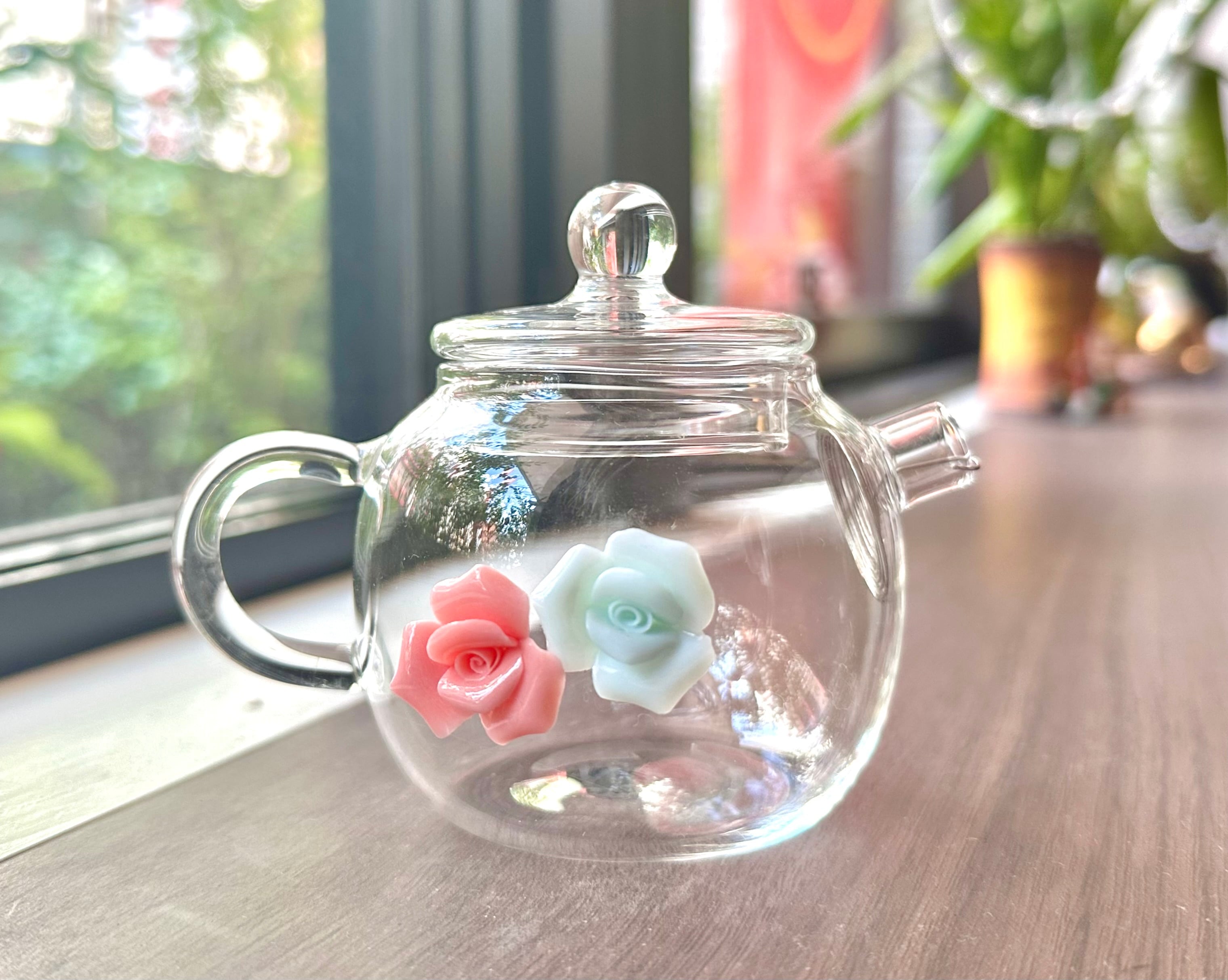 ピンクとブルーの手作り薔薇のデザインが美しい茶壷です。