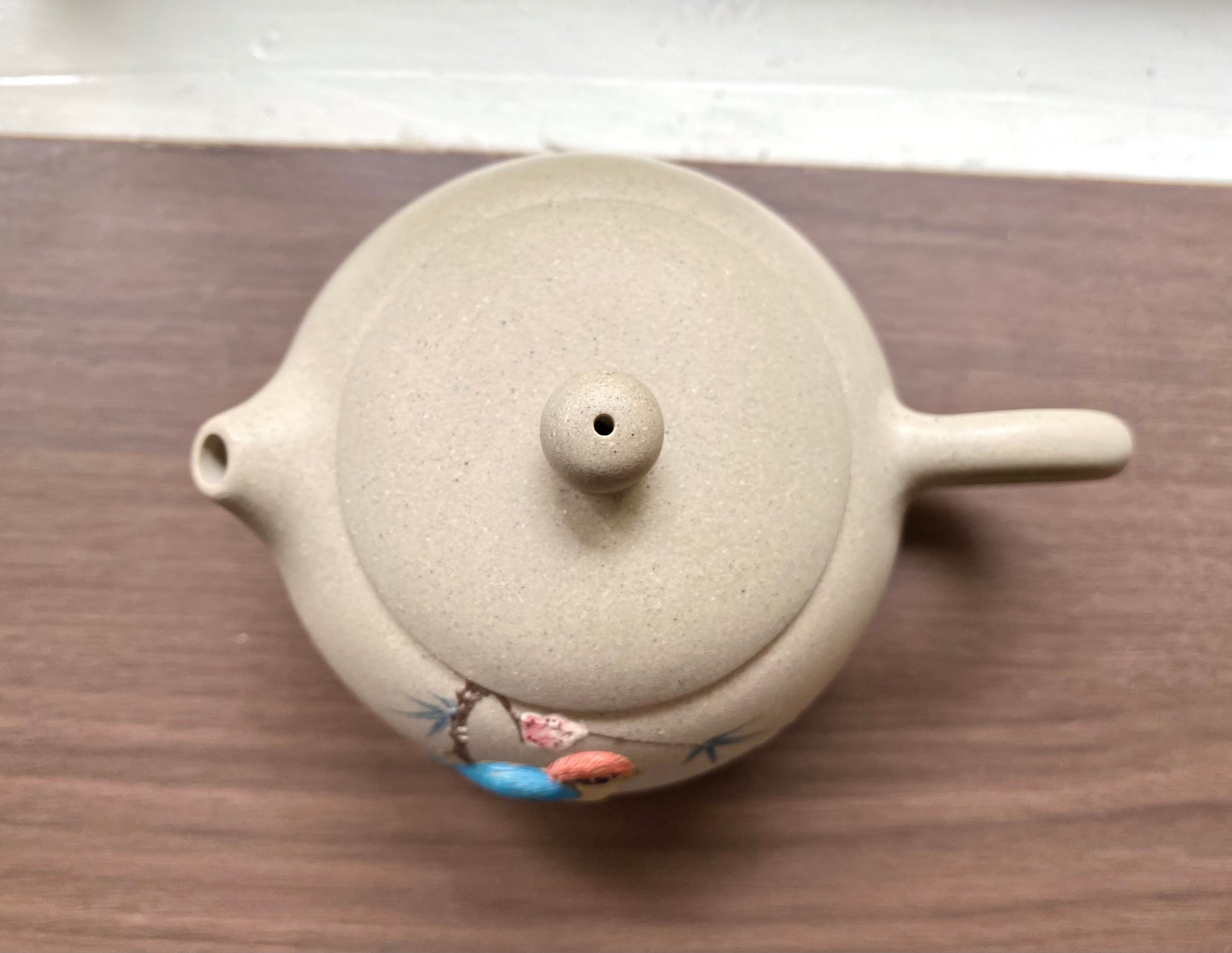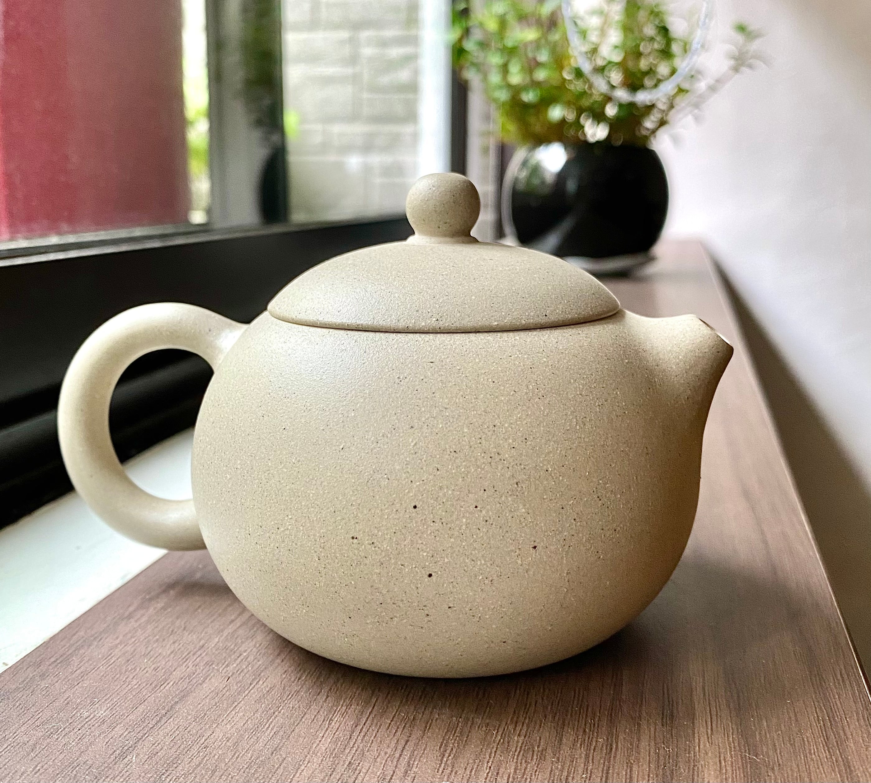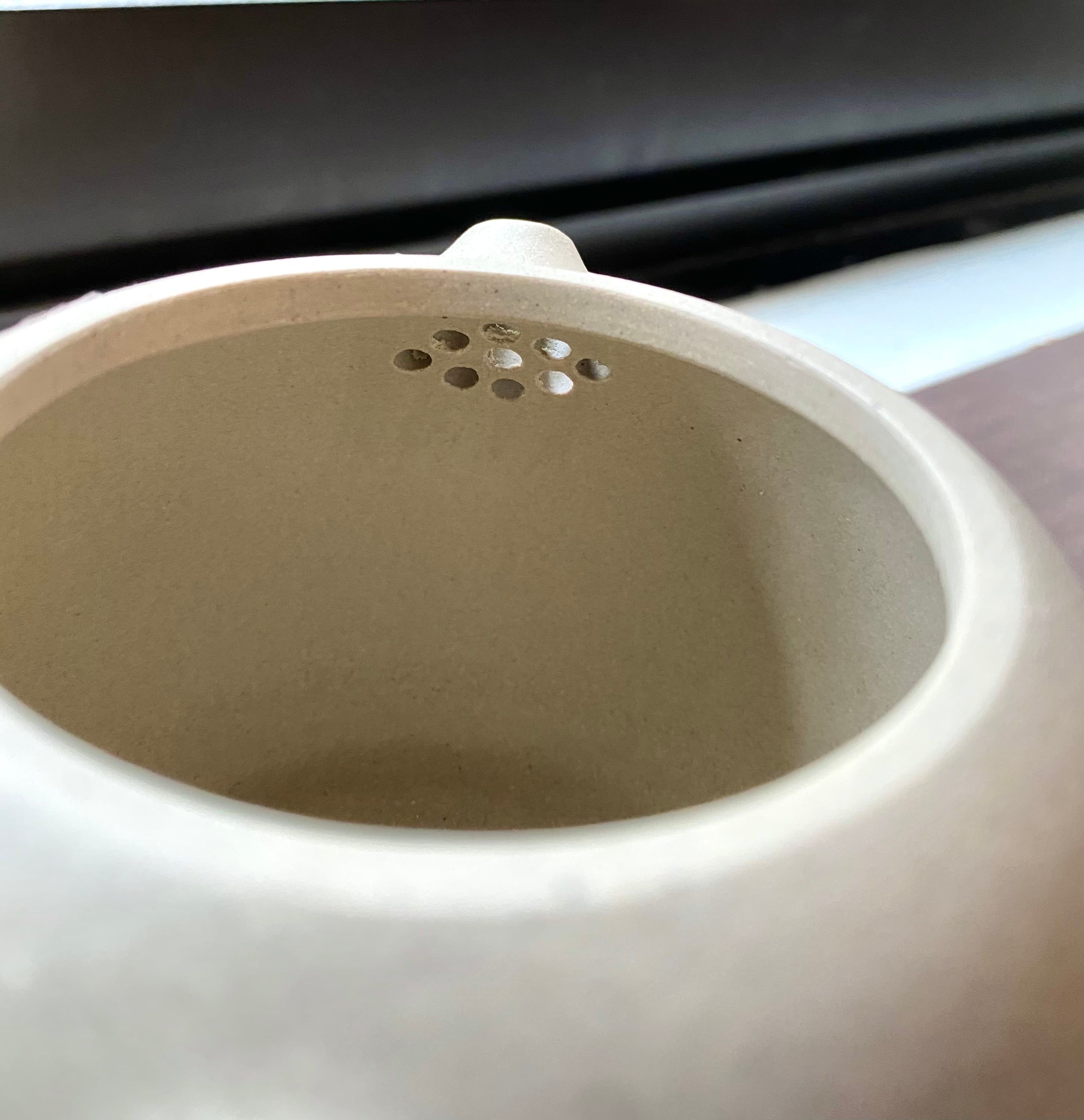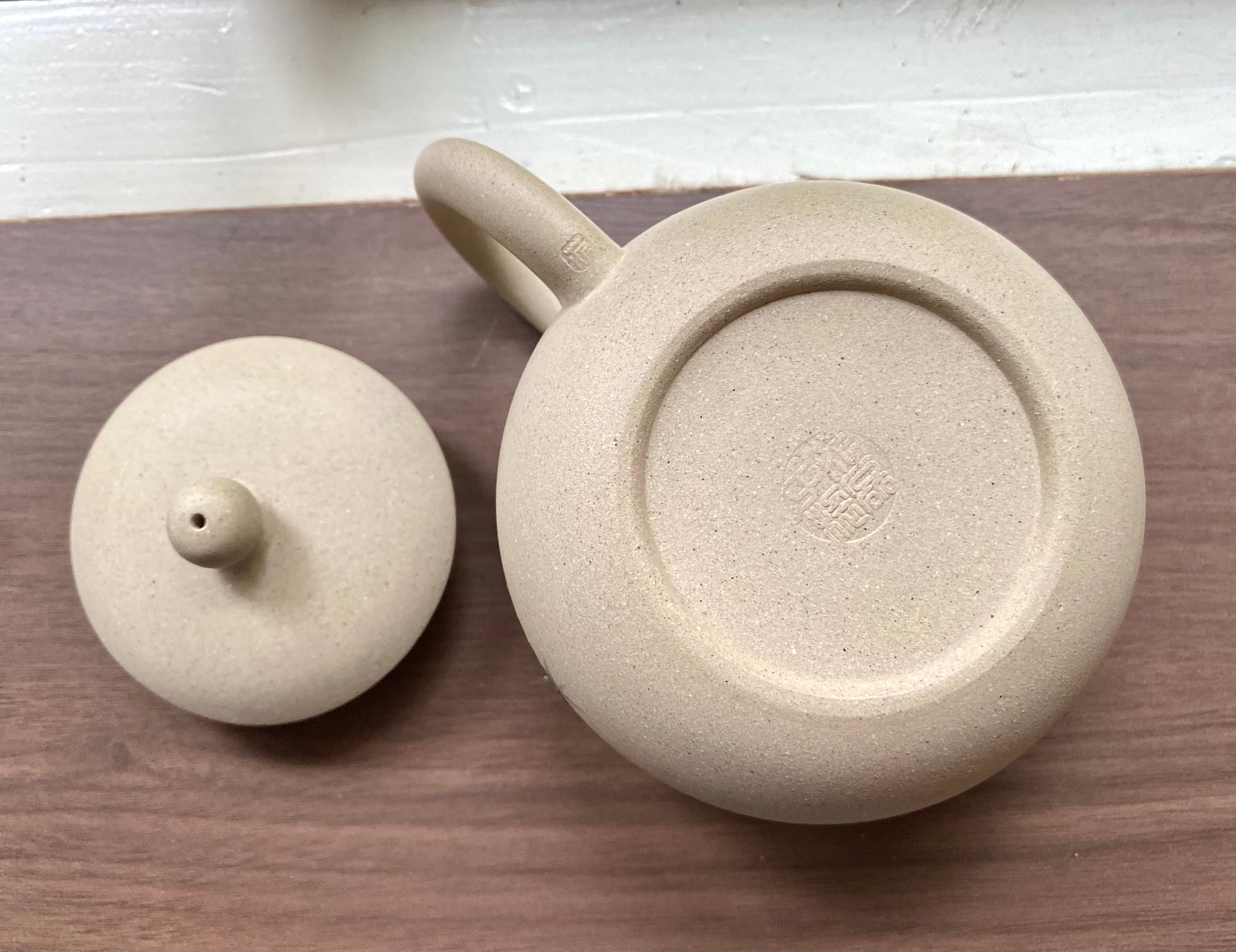紫砂の中でも白段泥という珍しいクリーム色の土を用いて作られた全手工の茶壷です。