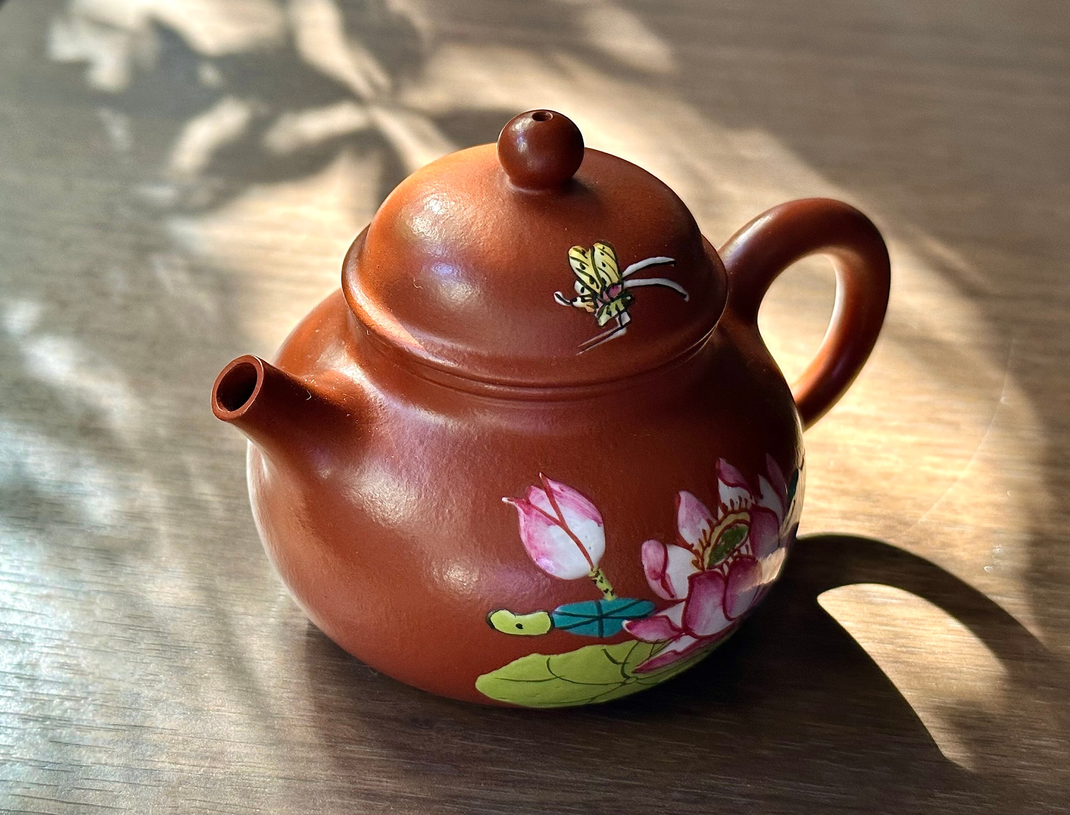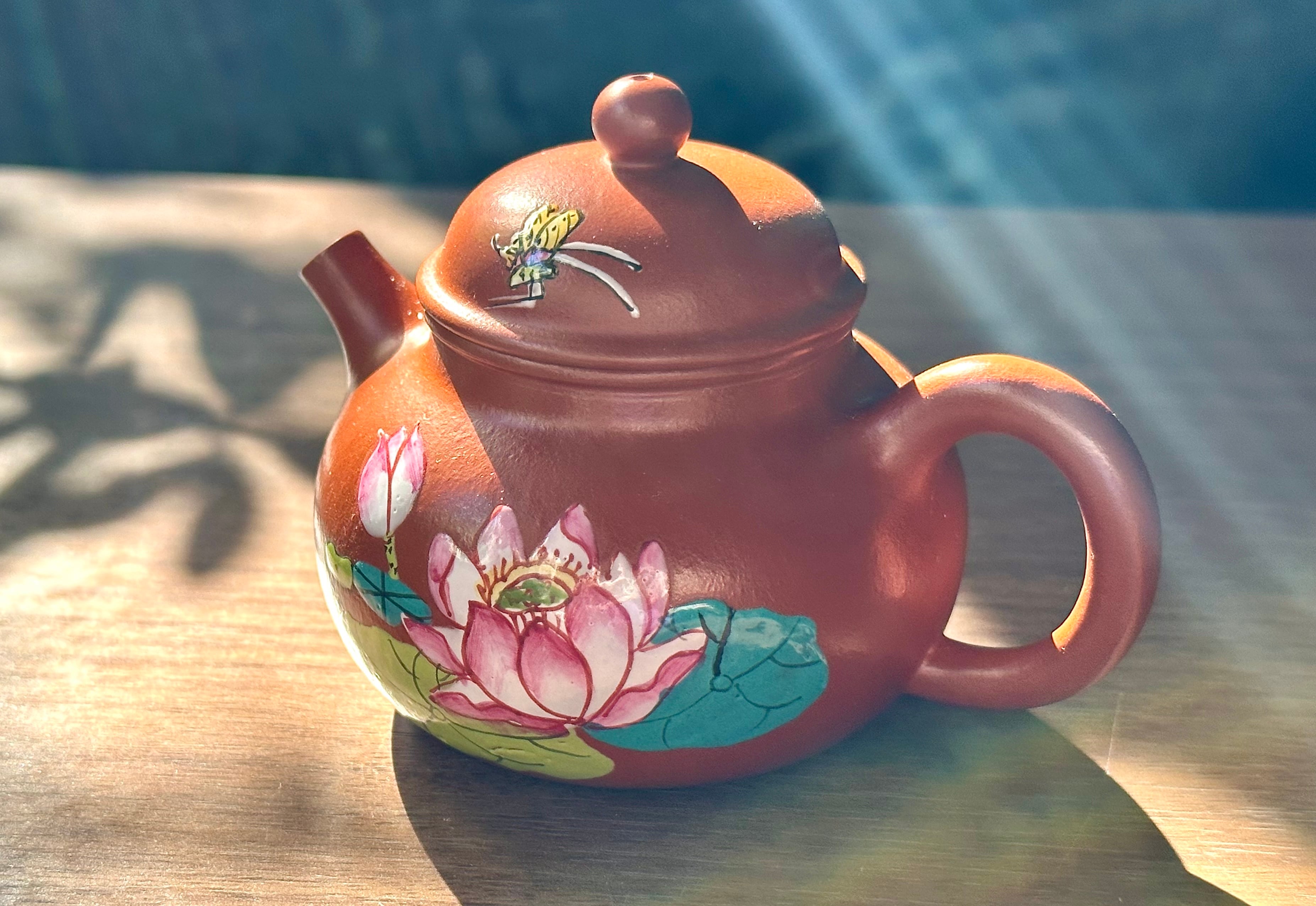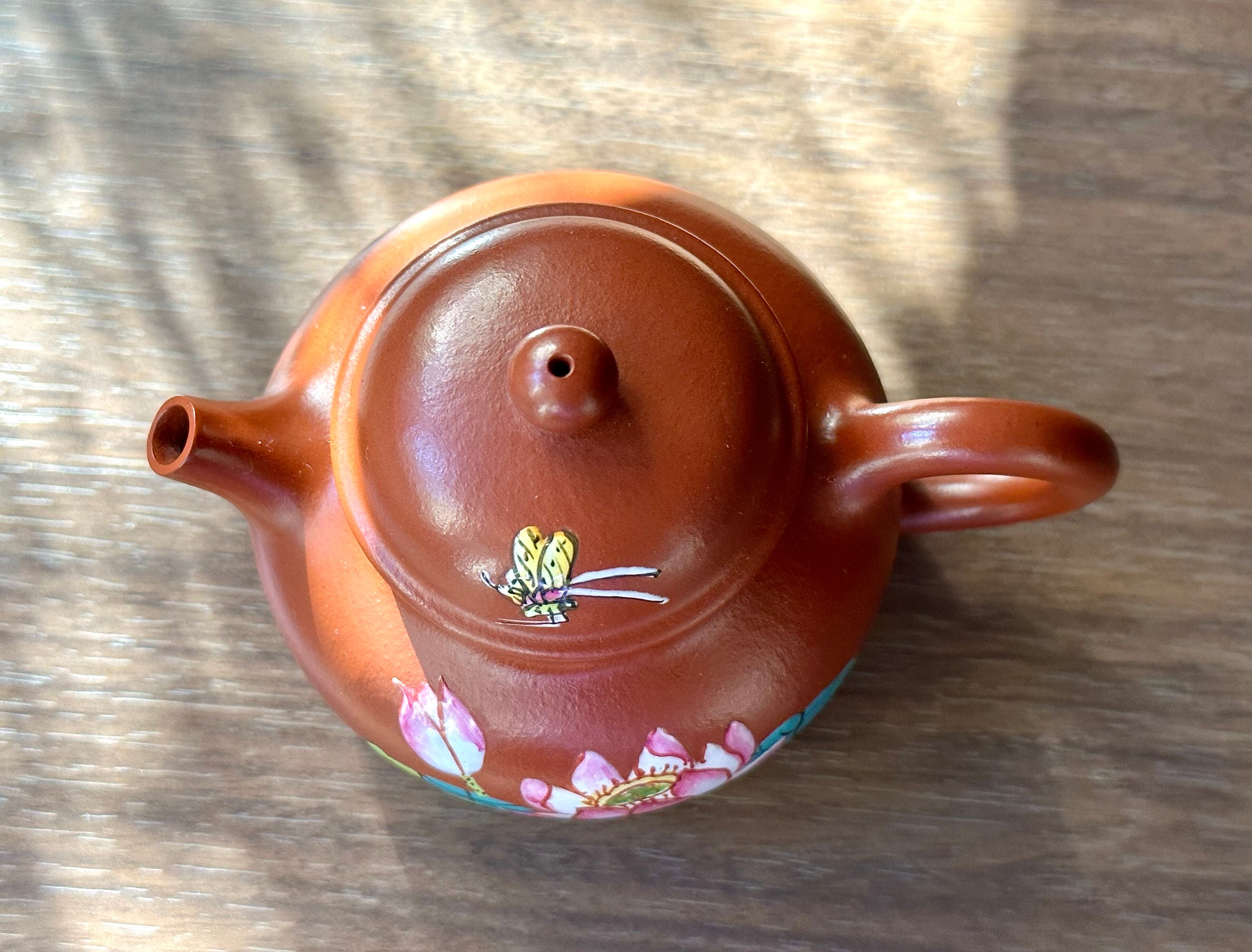 茶壷には珐琅彩という技法を用いてデザインされた蓮花が美しい一品です。