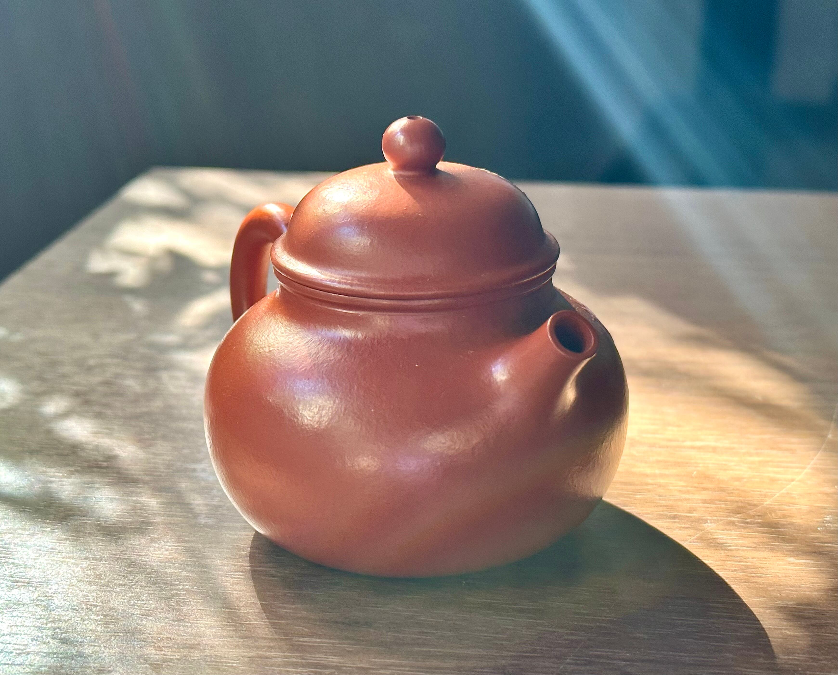 紫砂の中でも小煤窯朱泥という質の良い艶のある赤みを帯びたオレンジ色の土、そして更にその土をねかせることで滑らかな老朱泥に仕上げた珍しい土を用いて作られた全手工の茶壷です。