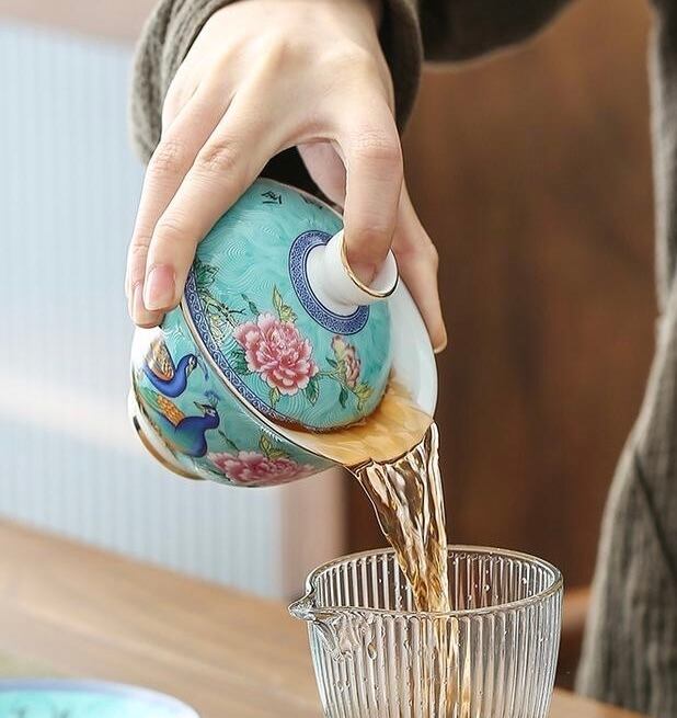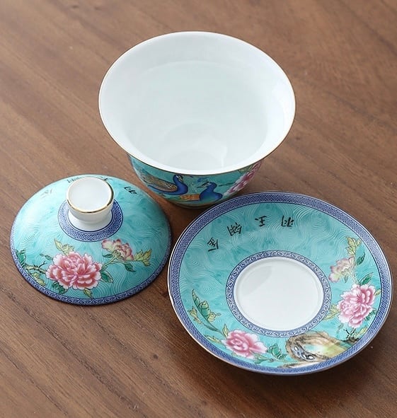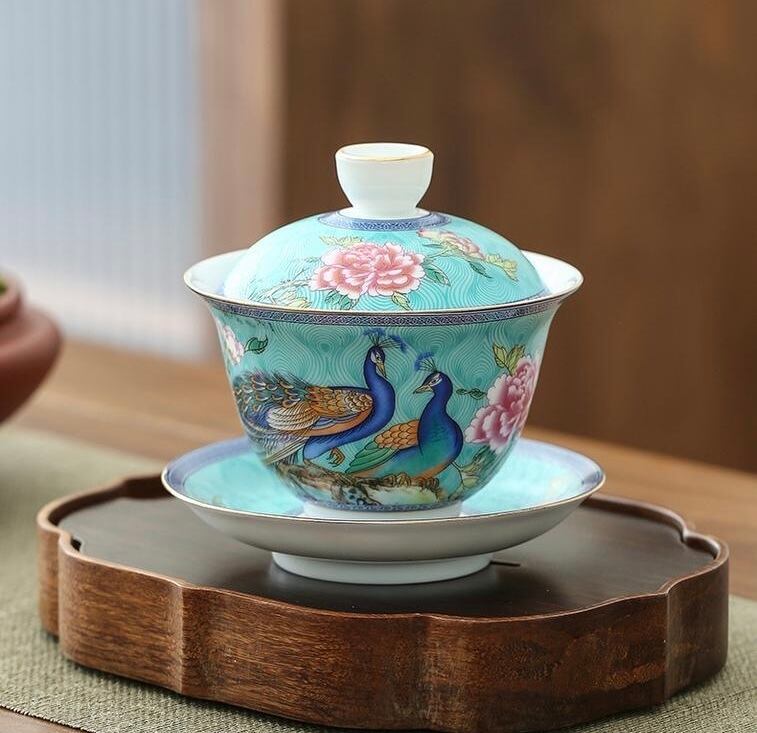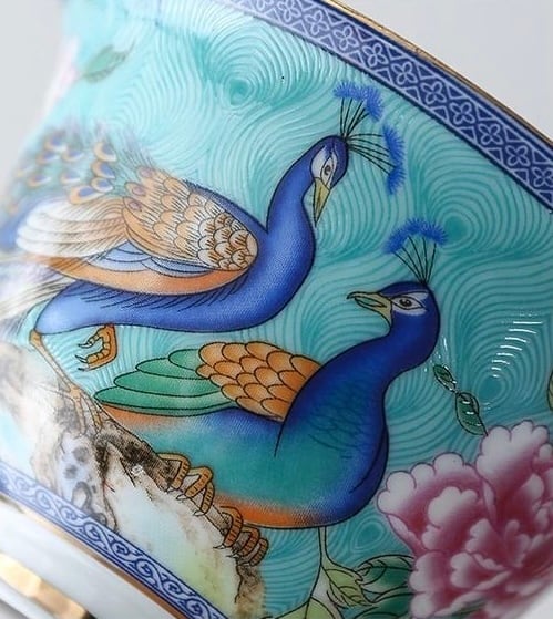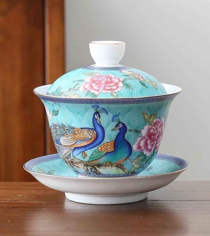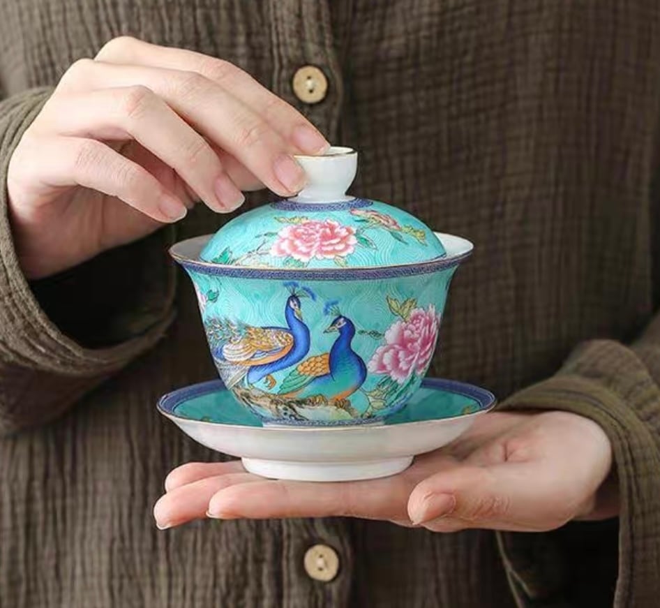 こちらは孔雀と牡丹の花が全体にデザインされ、更にはゴールド色の釉薬で蓋や器、ソーサーの縁には手描きでラインがほどこされたこだわりの一品です。