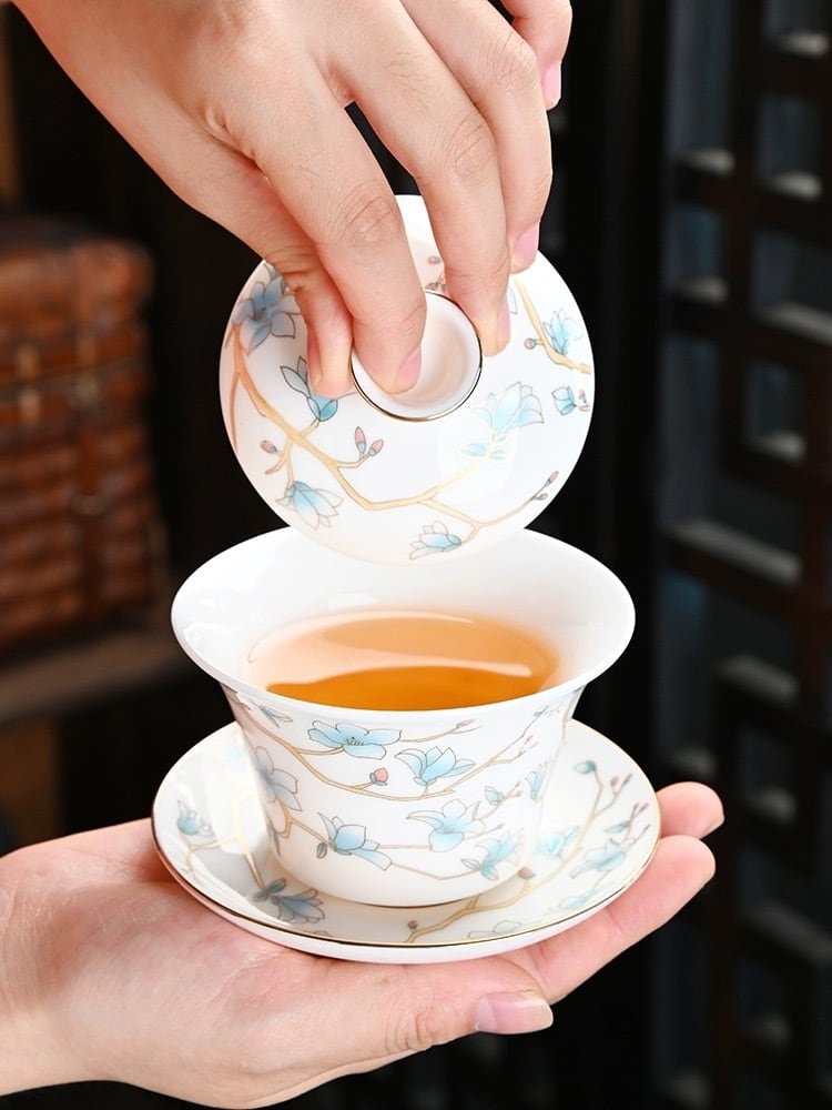 茶器の名産地徳化産の蓋碗。ブルーのデザインです。