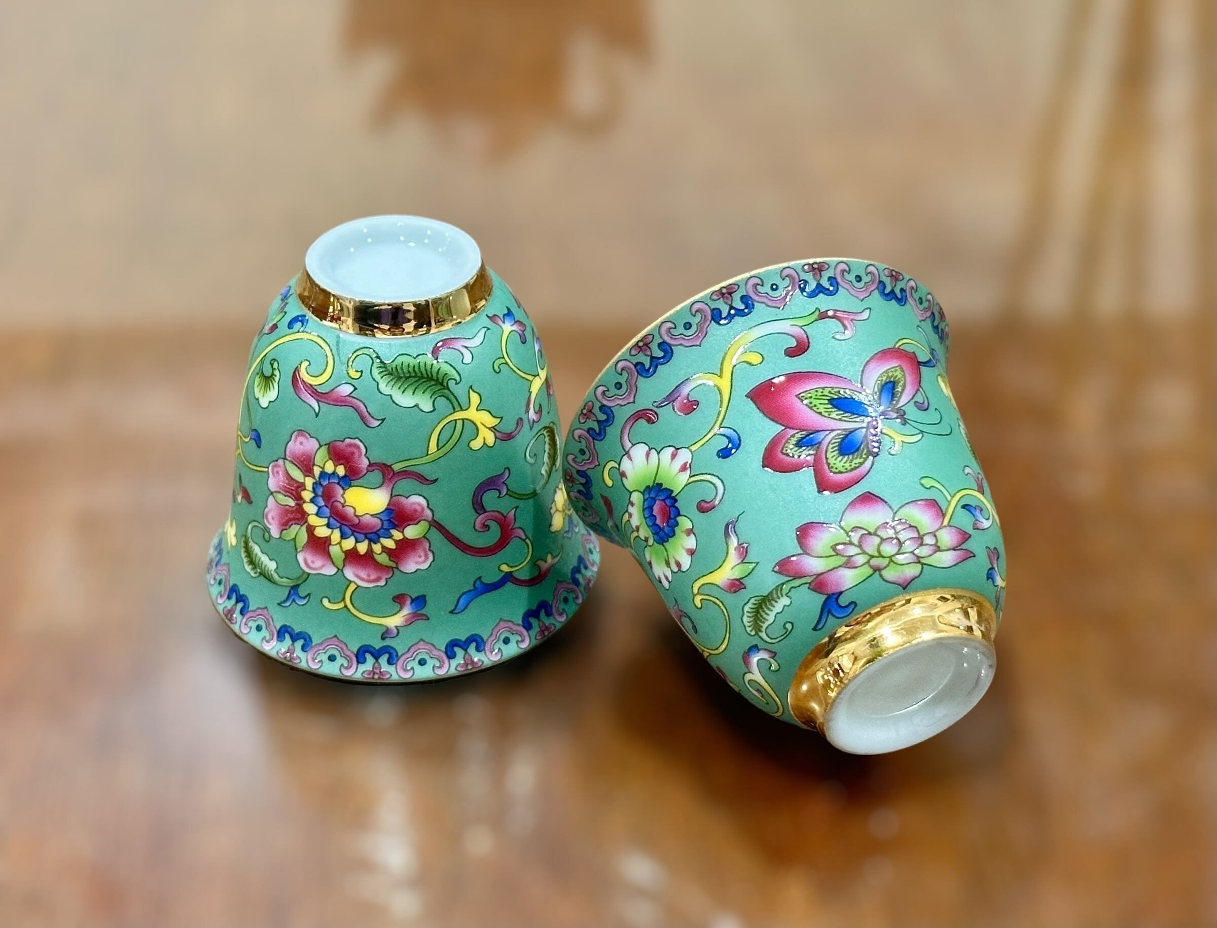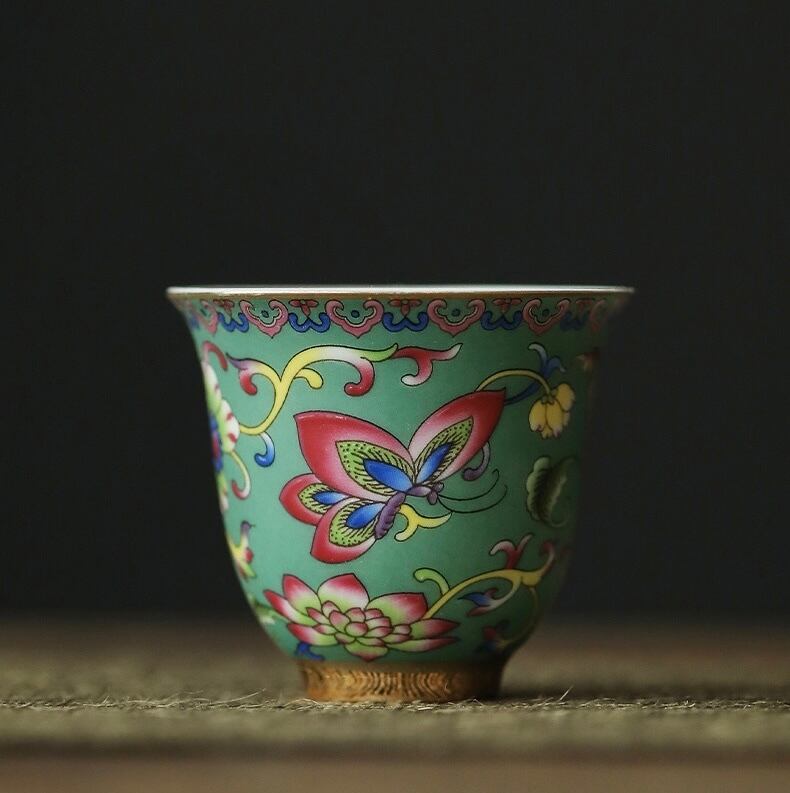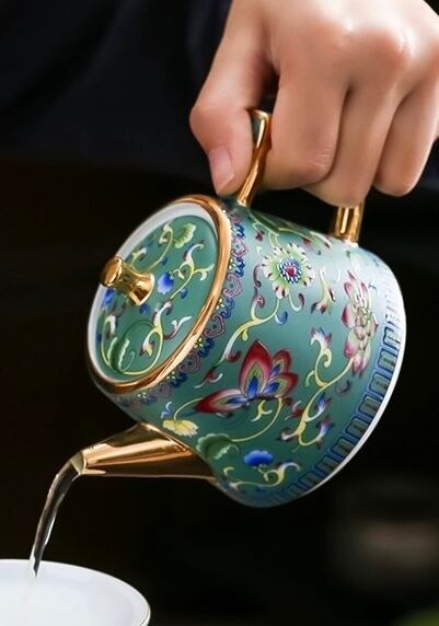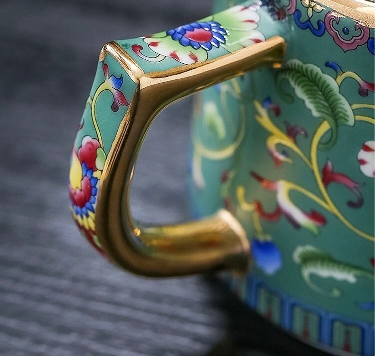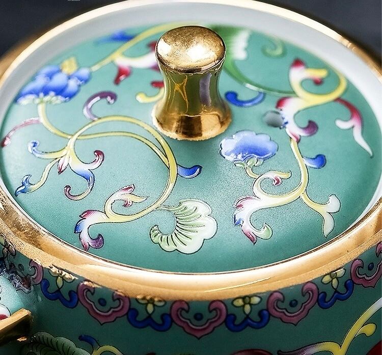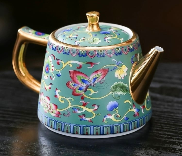 宮廷風の縁起の良い蓮花の細かなデザインと蝶々が茶器全体に施された一品。