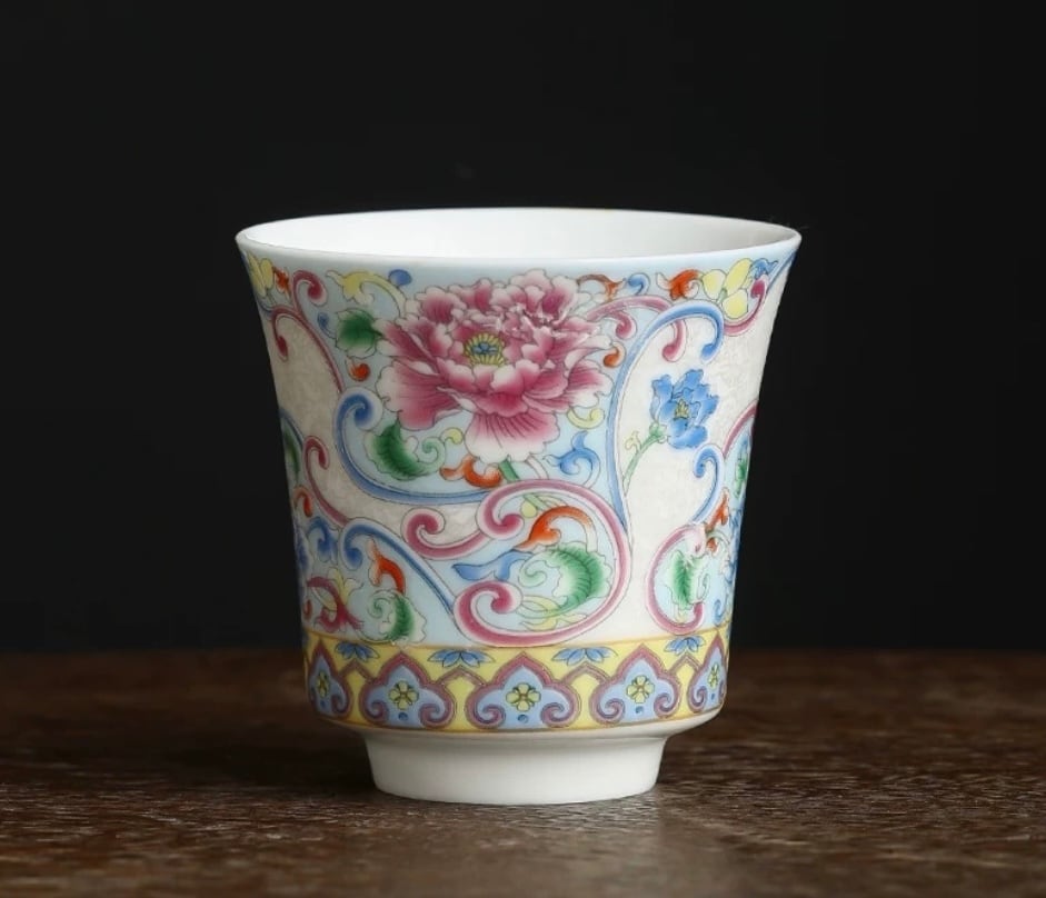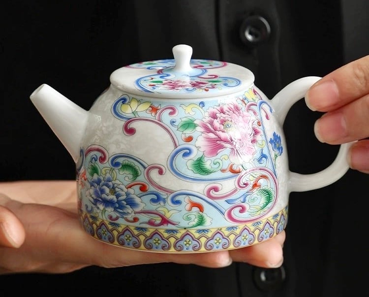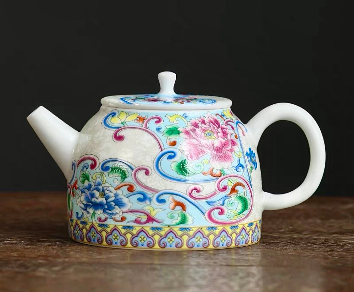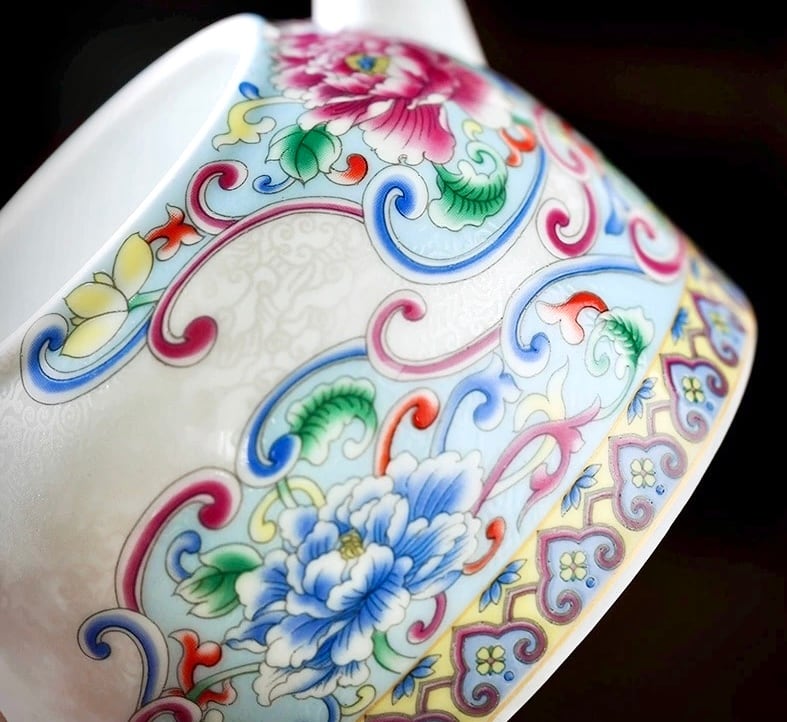 【珐琅彩】とは、ガラスのようなぷっくりとした光沢感が美しい技法を用いて描かれた少し立体的なデザインです。景徳鎮では大変有名は技法。