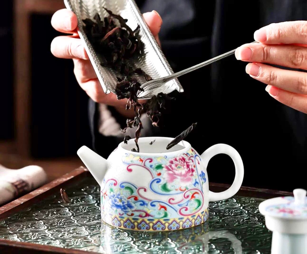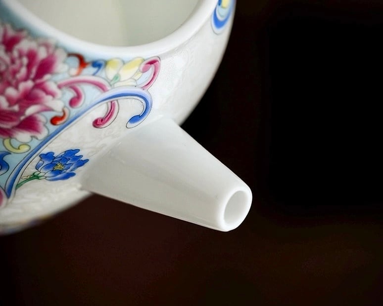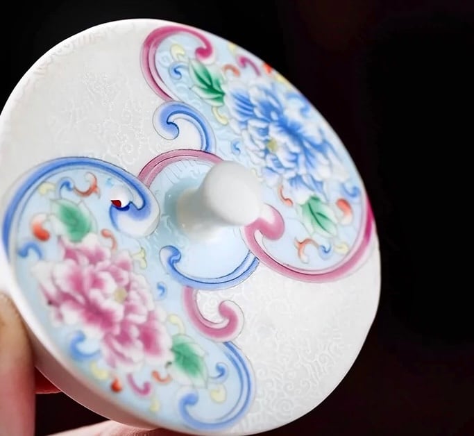 こちらは牡丹の花と蓮の花が全体にデザインされ、更にはシルバー色の釉薬で茶器全体を隙間なく祥雲という縁起の良い雲ながらが繊細にほどこされたこだわりの一品です。