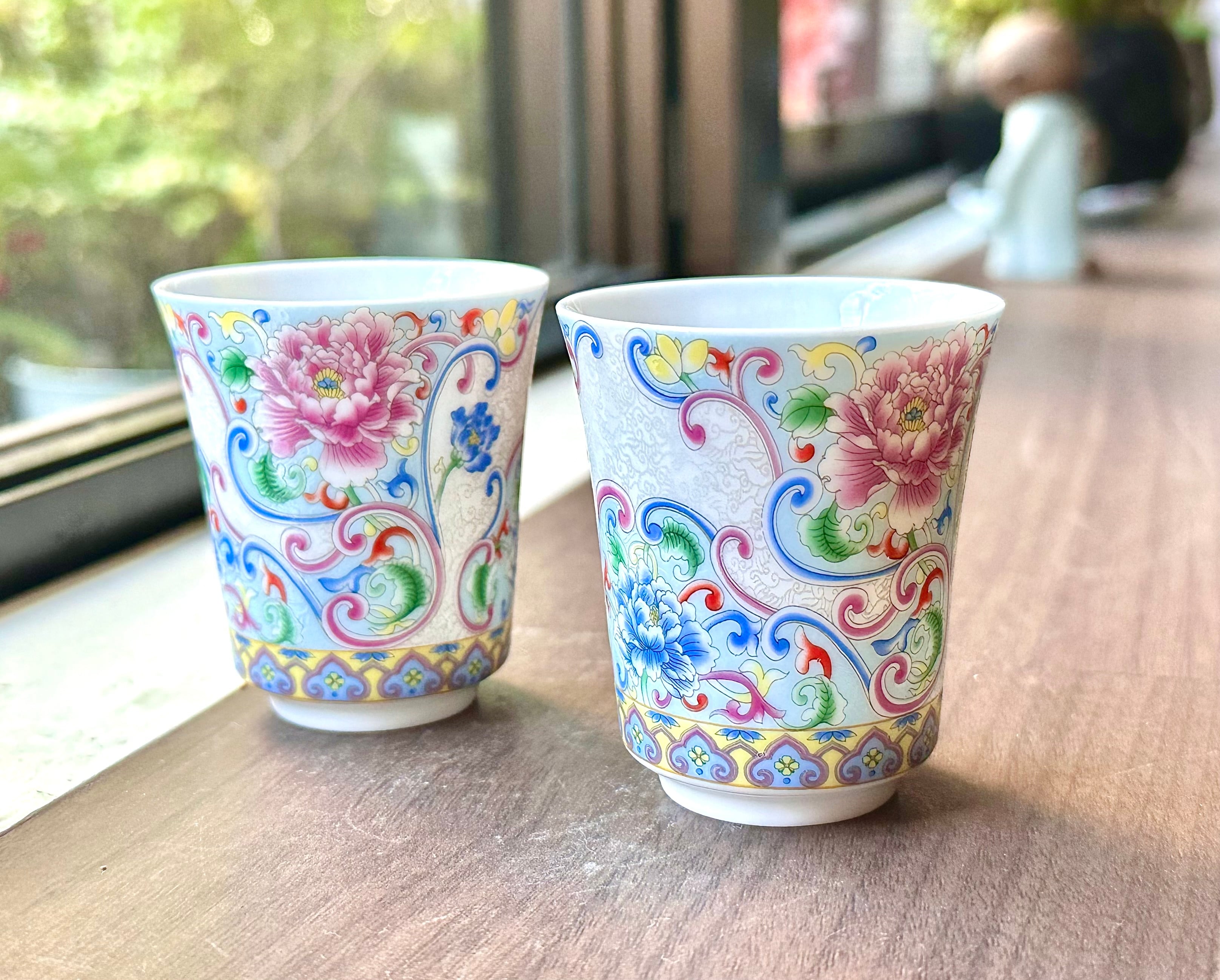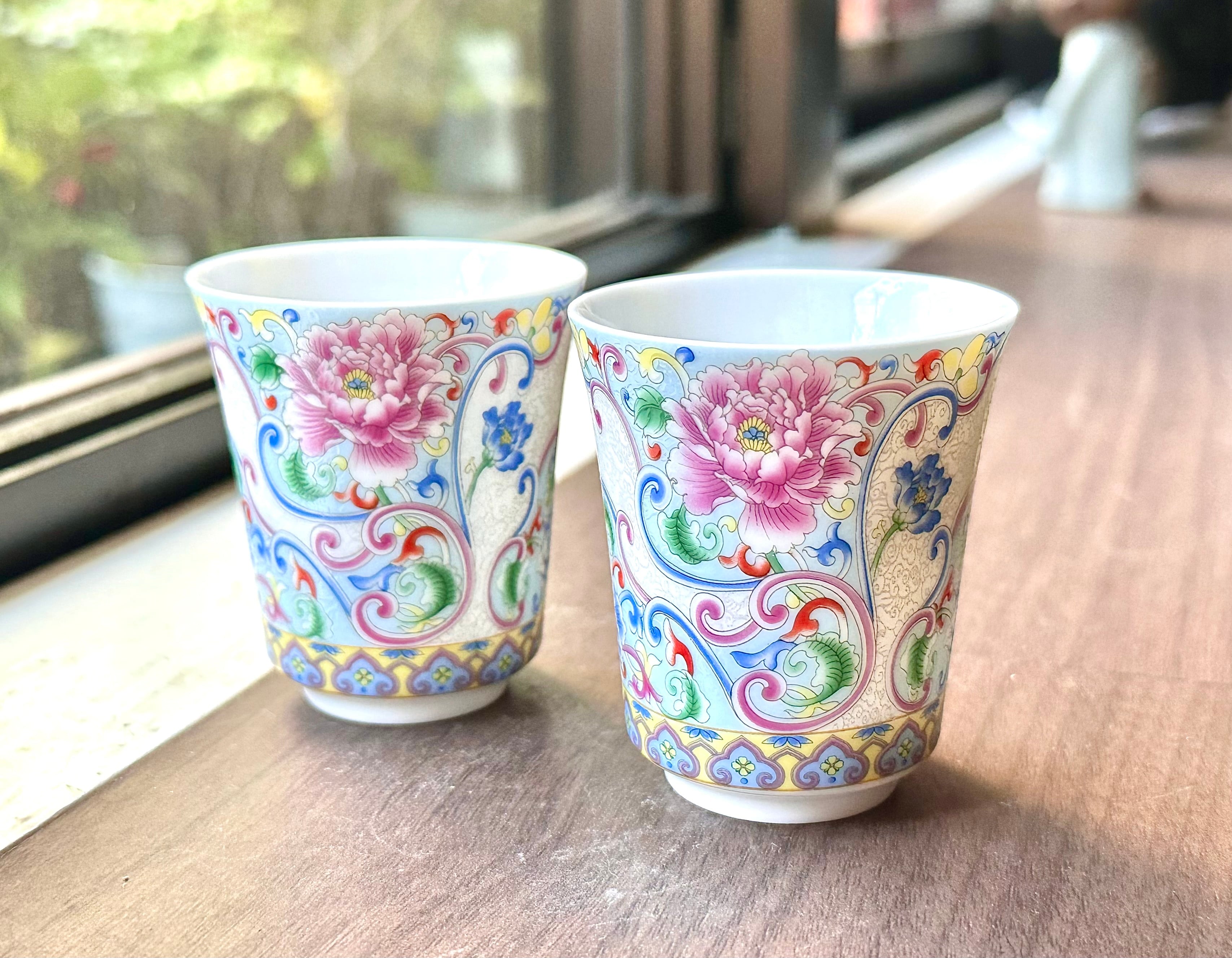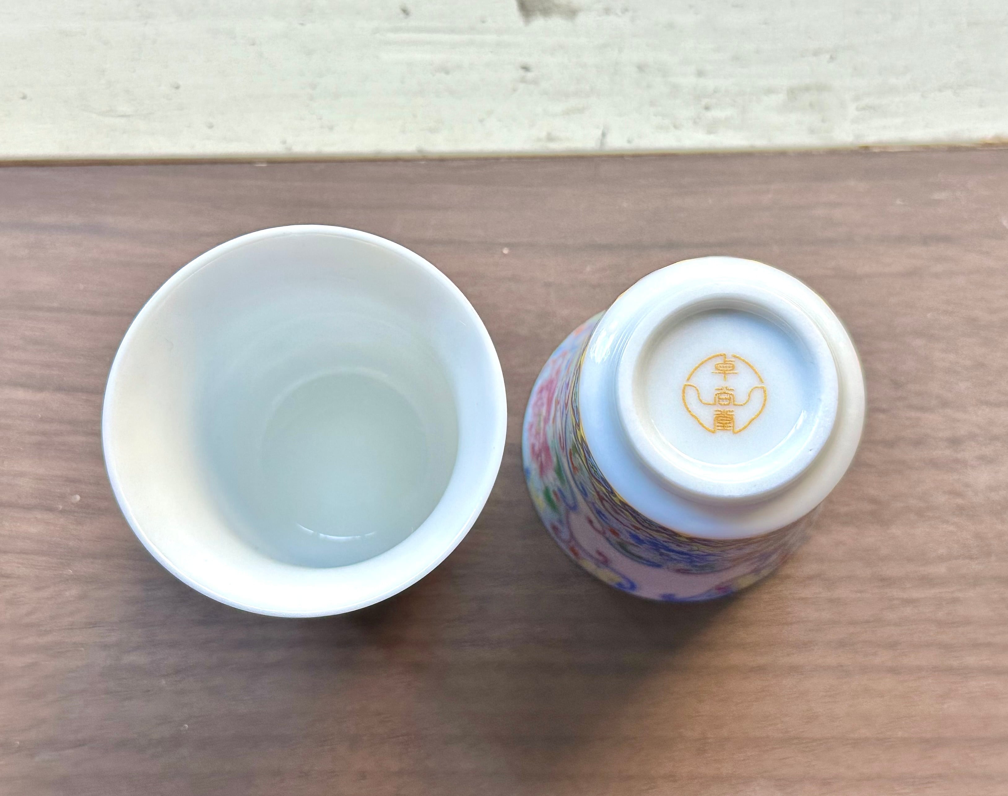 【珐琅彩】とは、ガラスのようなぷっくりとした光沢感が美しい技法を用いて描かれた少し立体的なデザインです。景徳鎮では大変有名は技法。