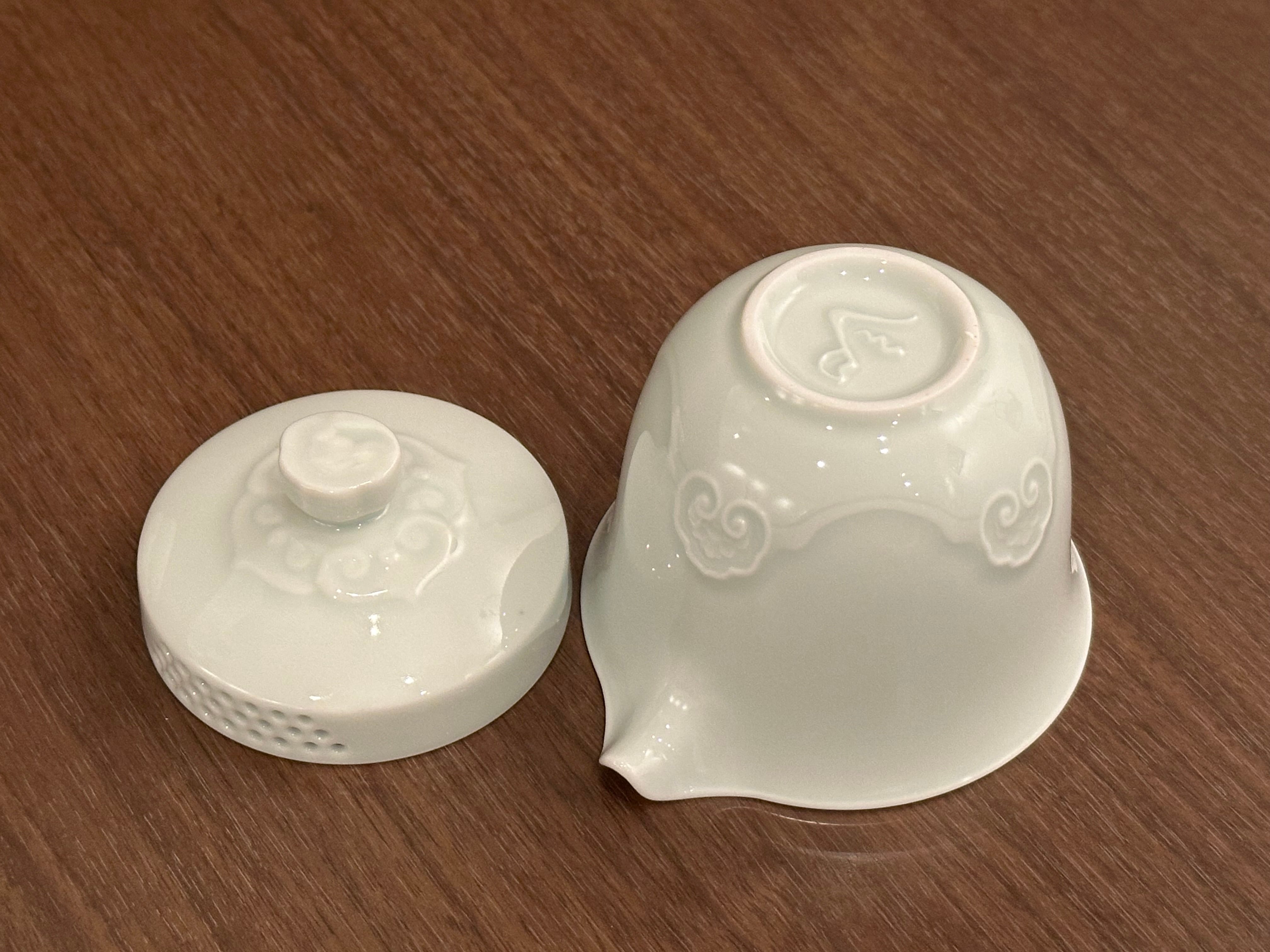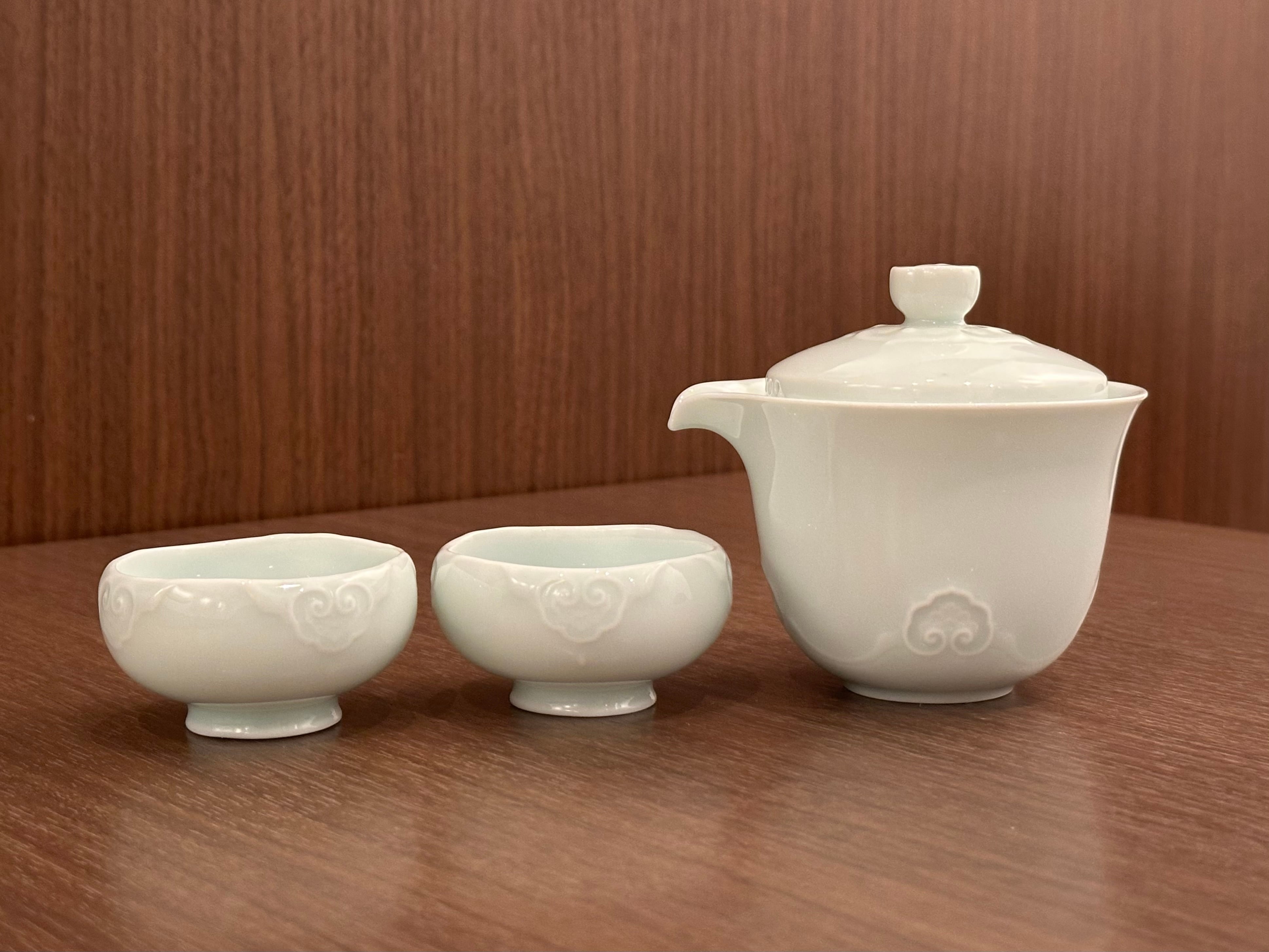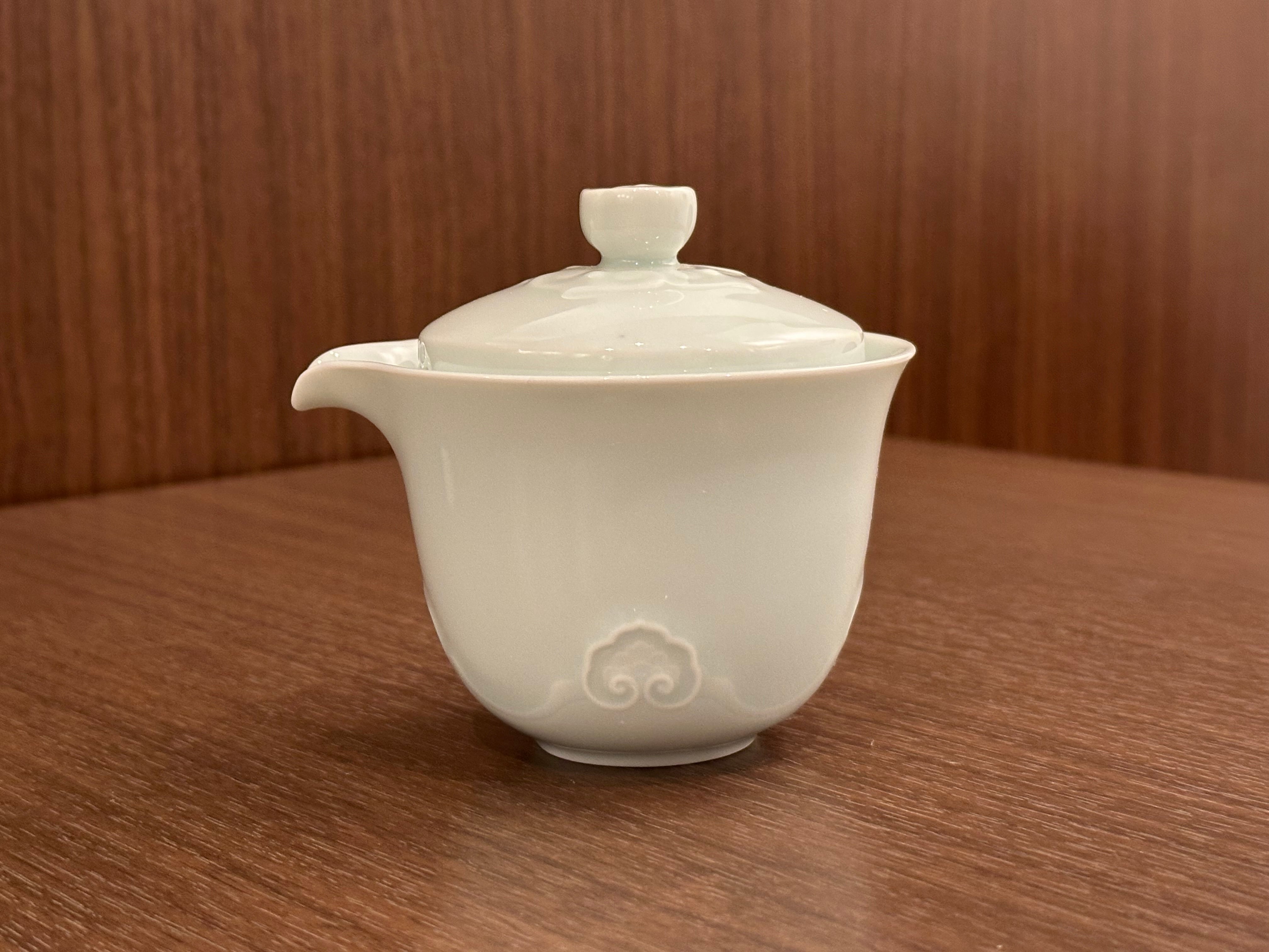 茶壷と茶杯はそれぞれ如意がデザインされており、茶壷の蓋や茶杯の縁に至るまで縁起の良い如意の模様が繊細に表現されています。