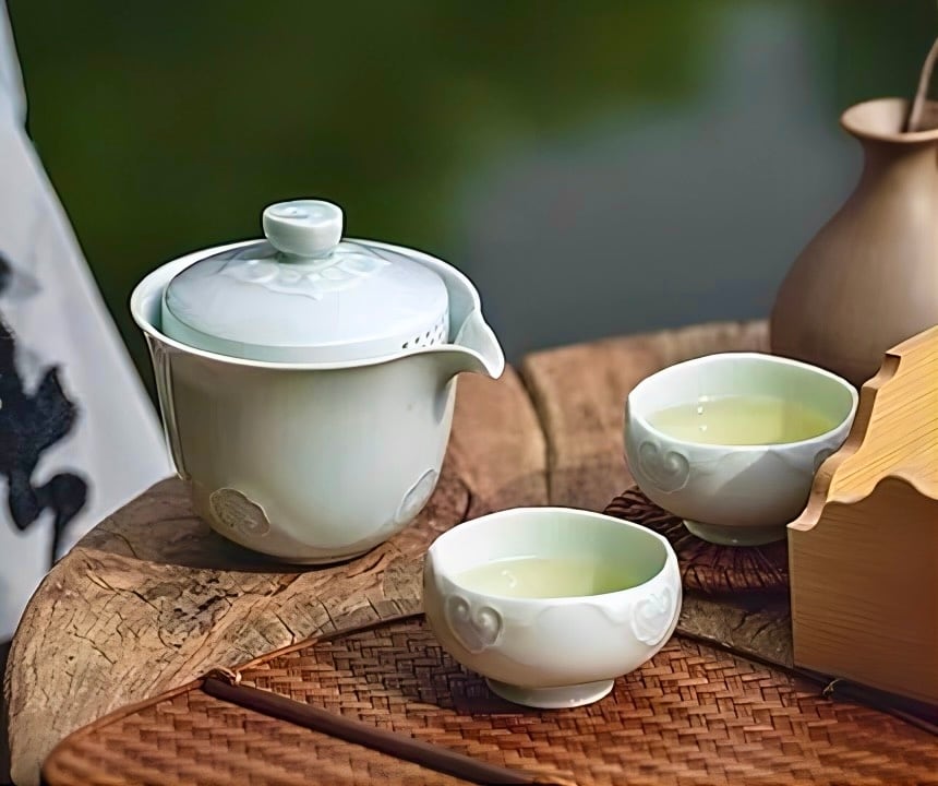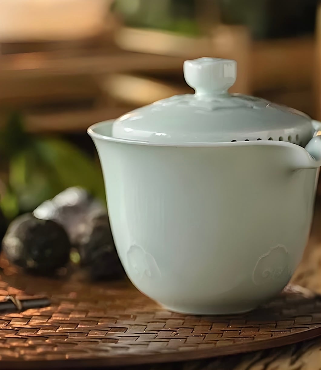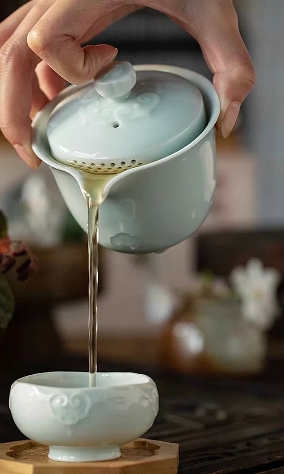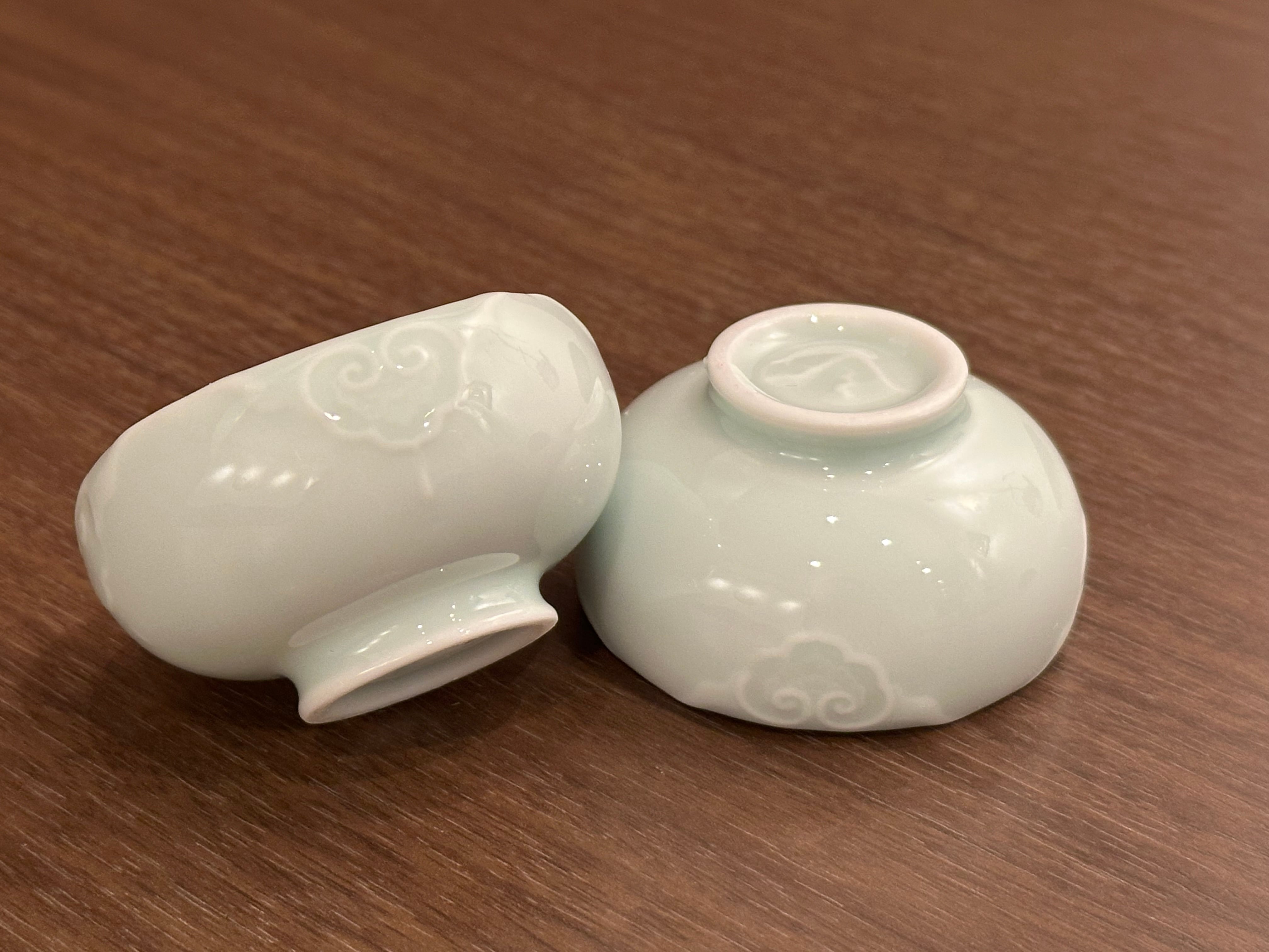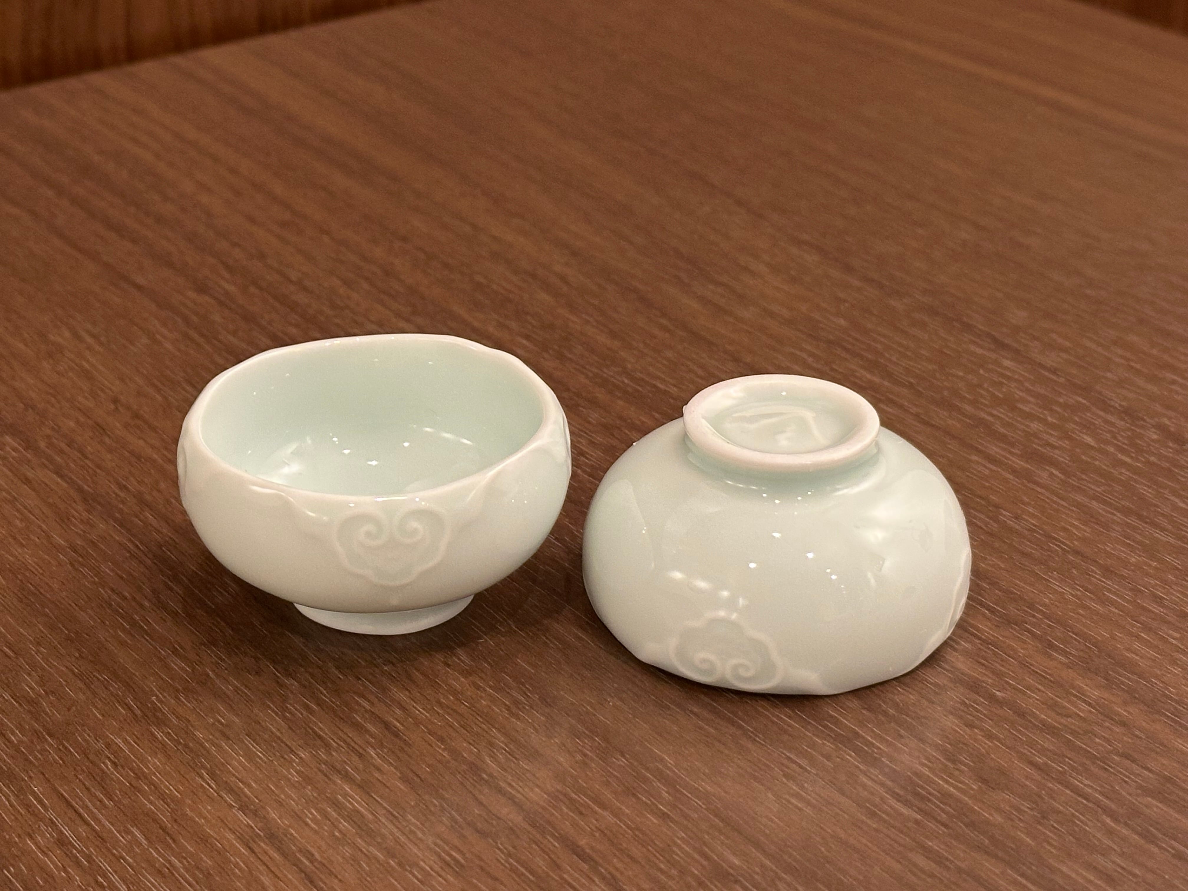 茶壷と茶杯はそれぞれ如意がデザインされており、茶壷の蓋や茶杯の縁に至るまで縁起の良い如意の模様が繊細に表現されています。