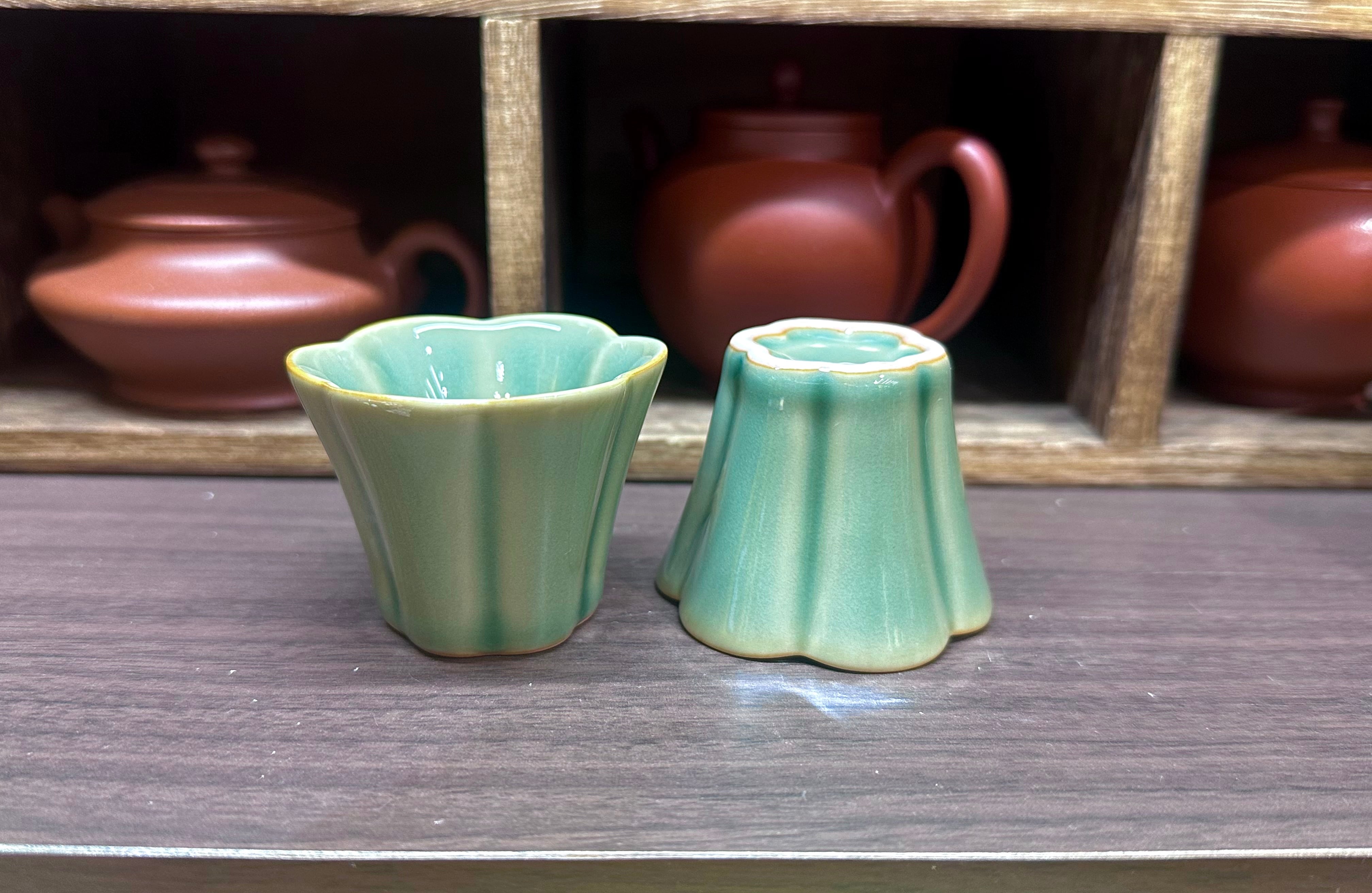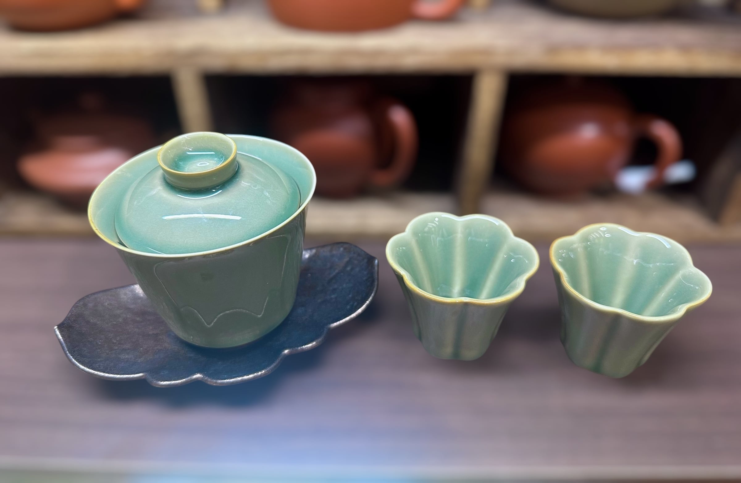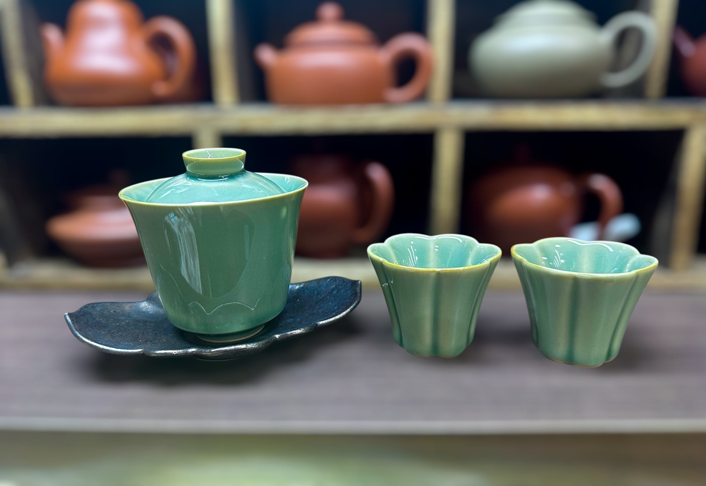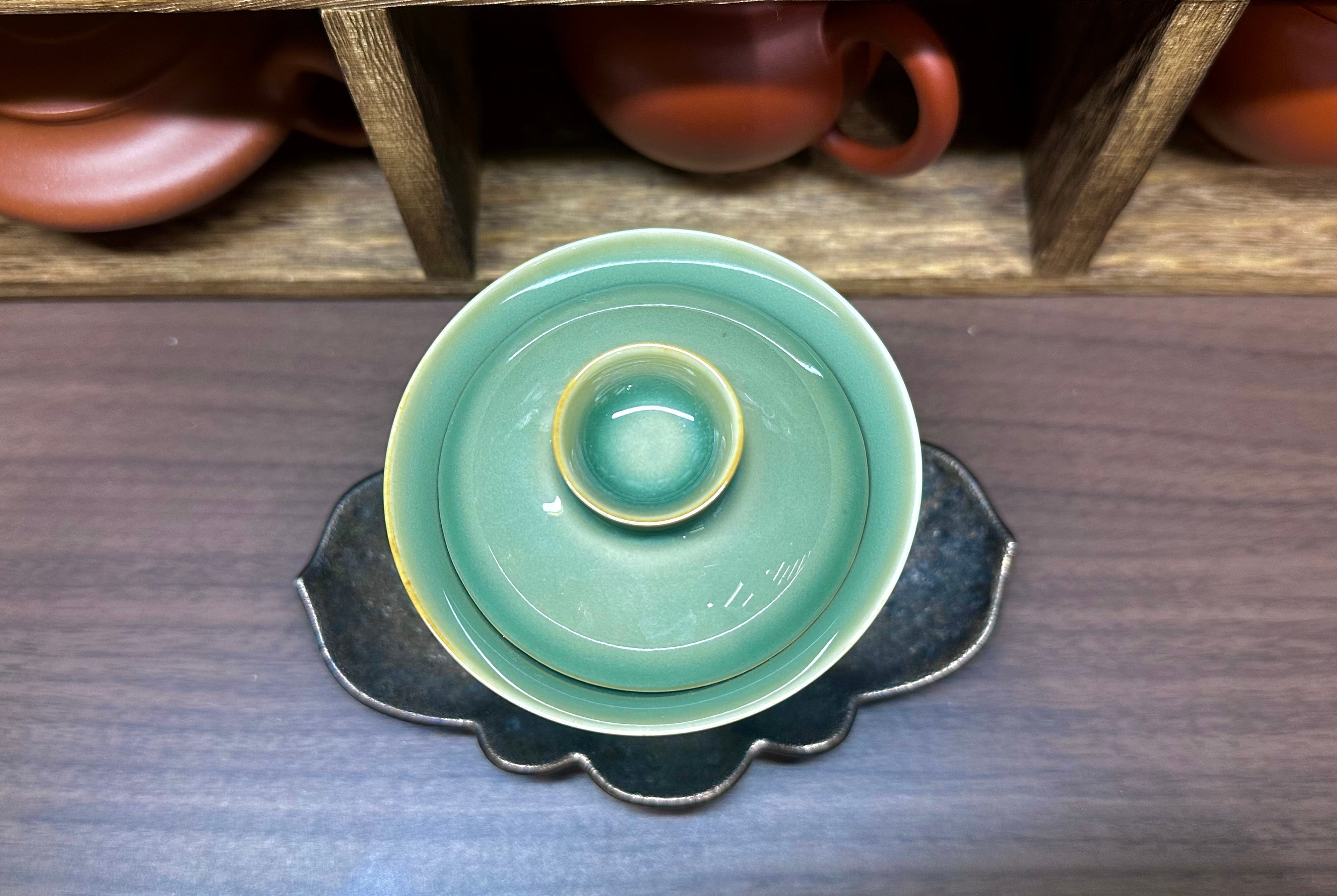深いグリーンの色合いが美しい青磁の蓋碗と茶杯になります。